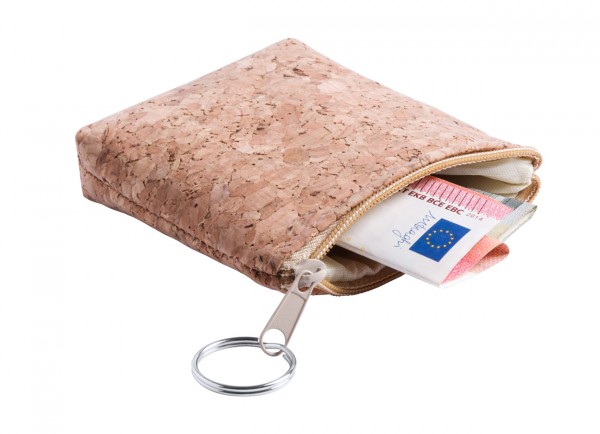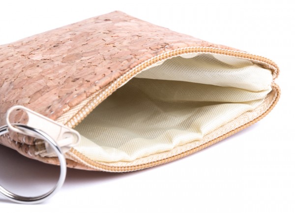 Portmoneu din plută, cu fermoar, cu căptușeală interioară și inel metalic pentru chei.