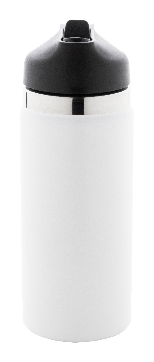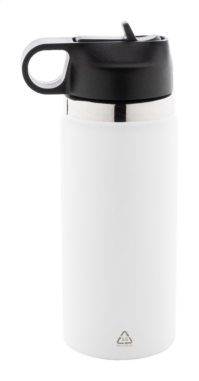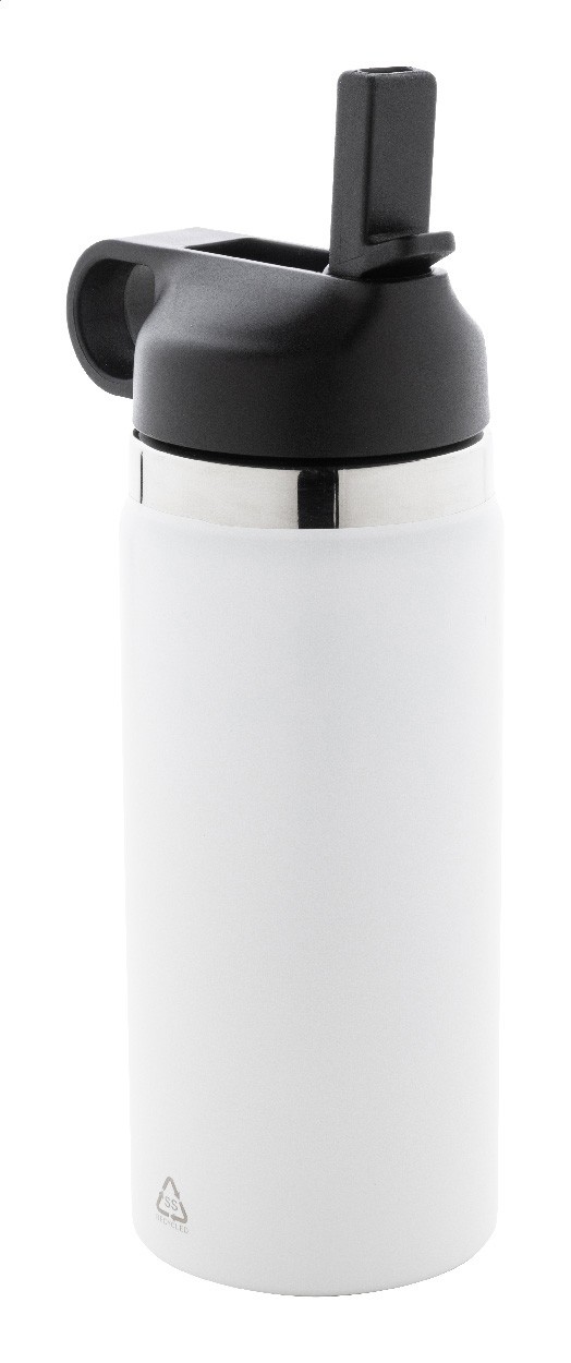 Sticlă termică, cu perete dublu, din oțel inoxidabil reciclat, cu capac rabatabil din PP, mâner de transport și pai integrat. 500 ml.