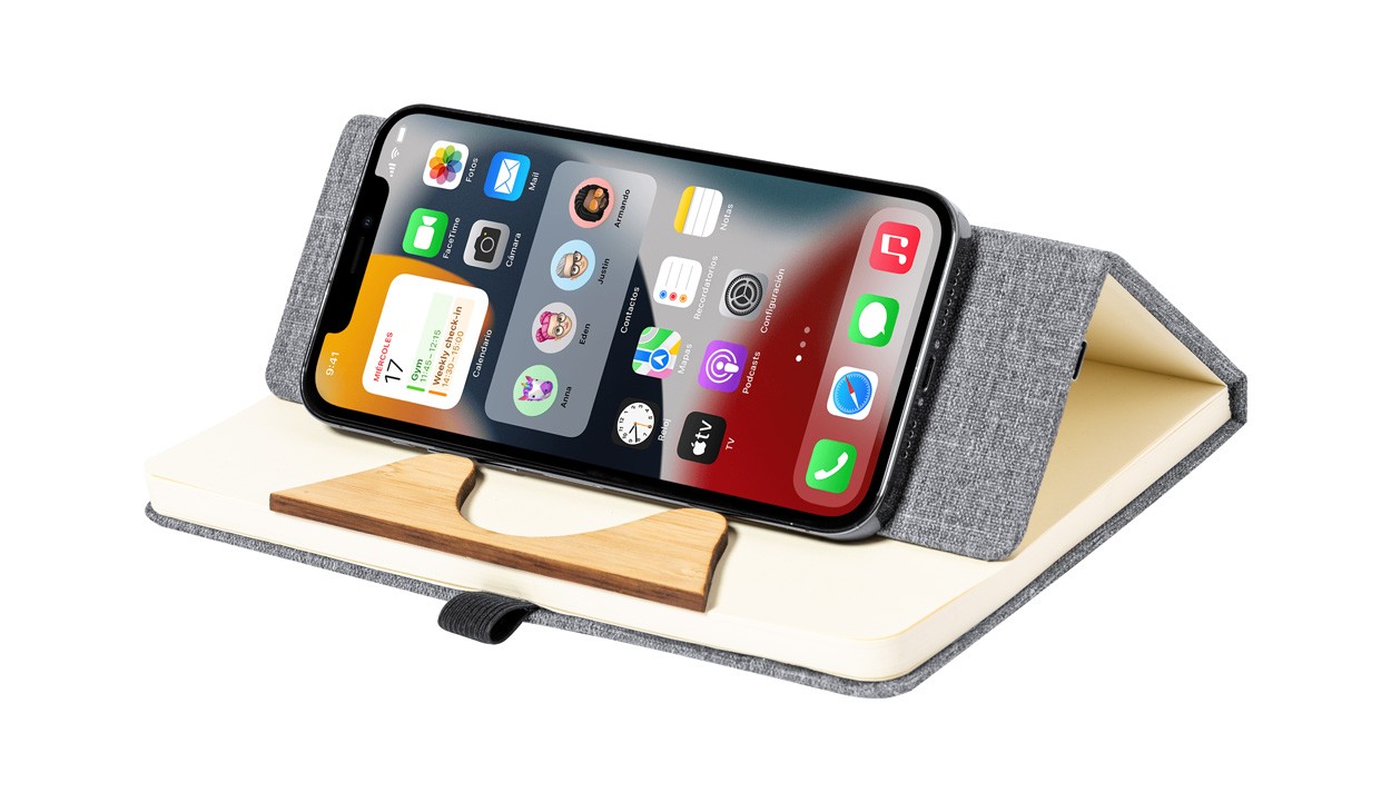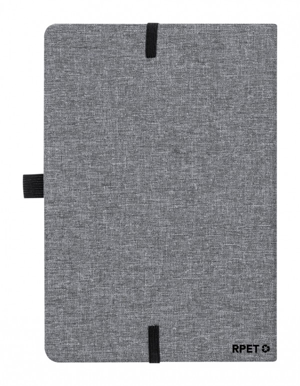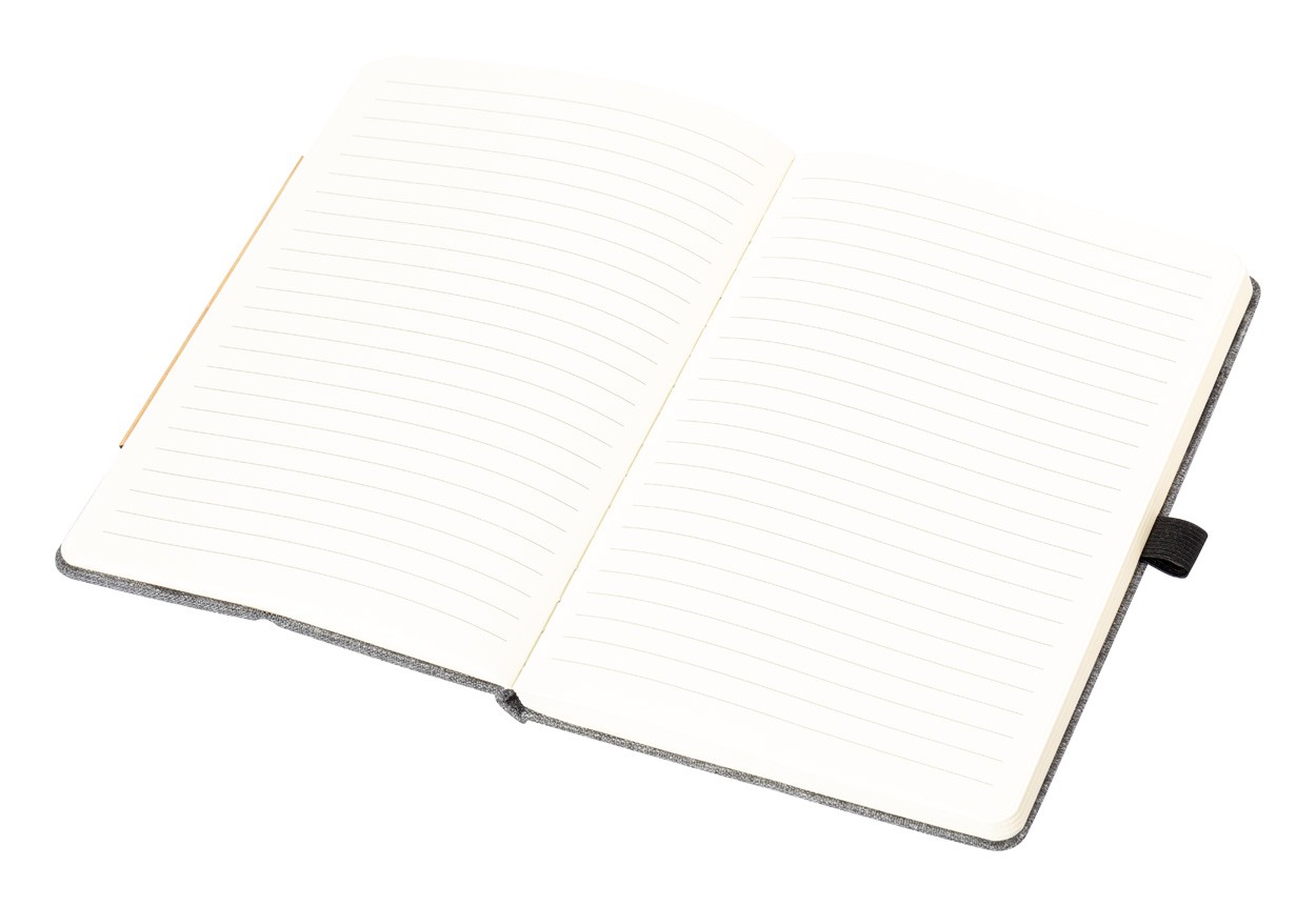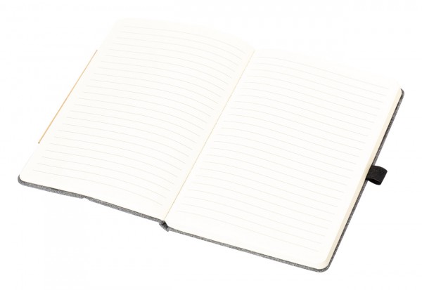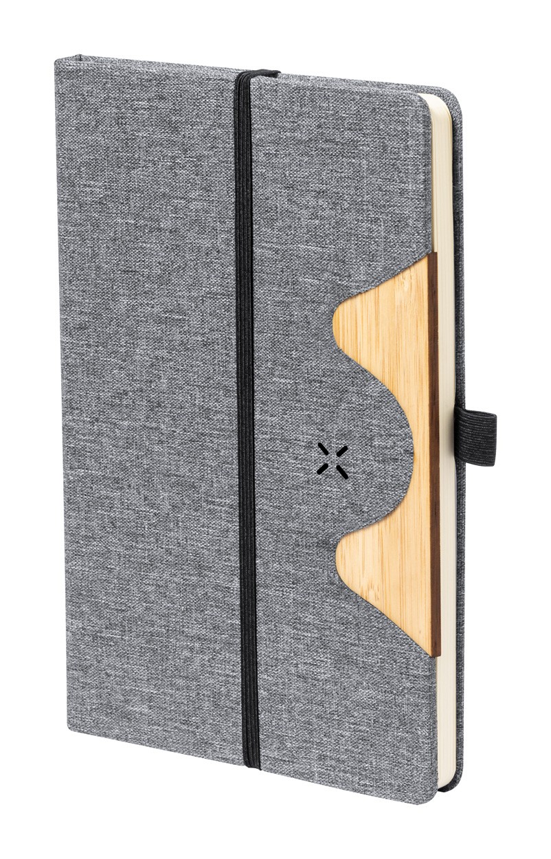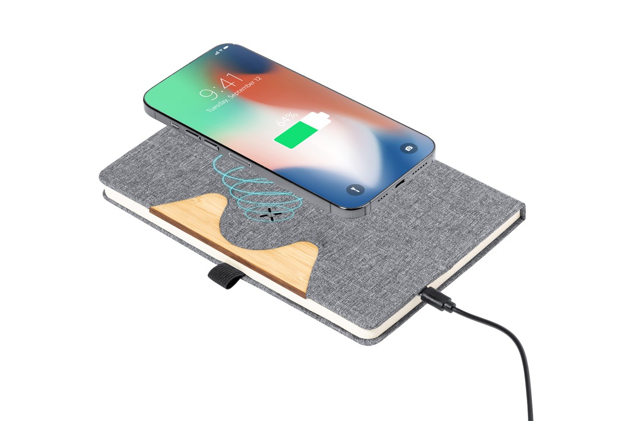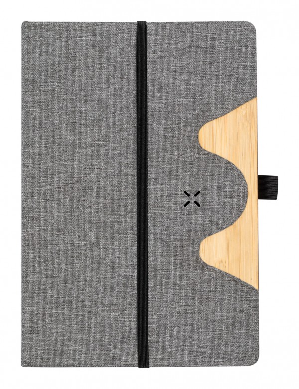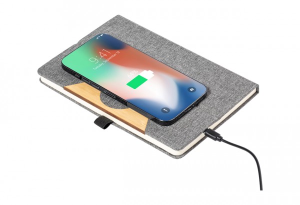 300D RPET polyester covered notebook with bamboo insert and built-in wireless fast charger (15W). With 80 lined sheets, A5 size. Including USB-C charger cable.