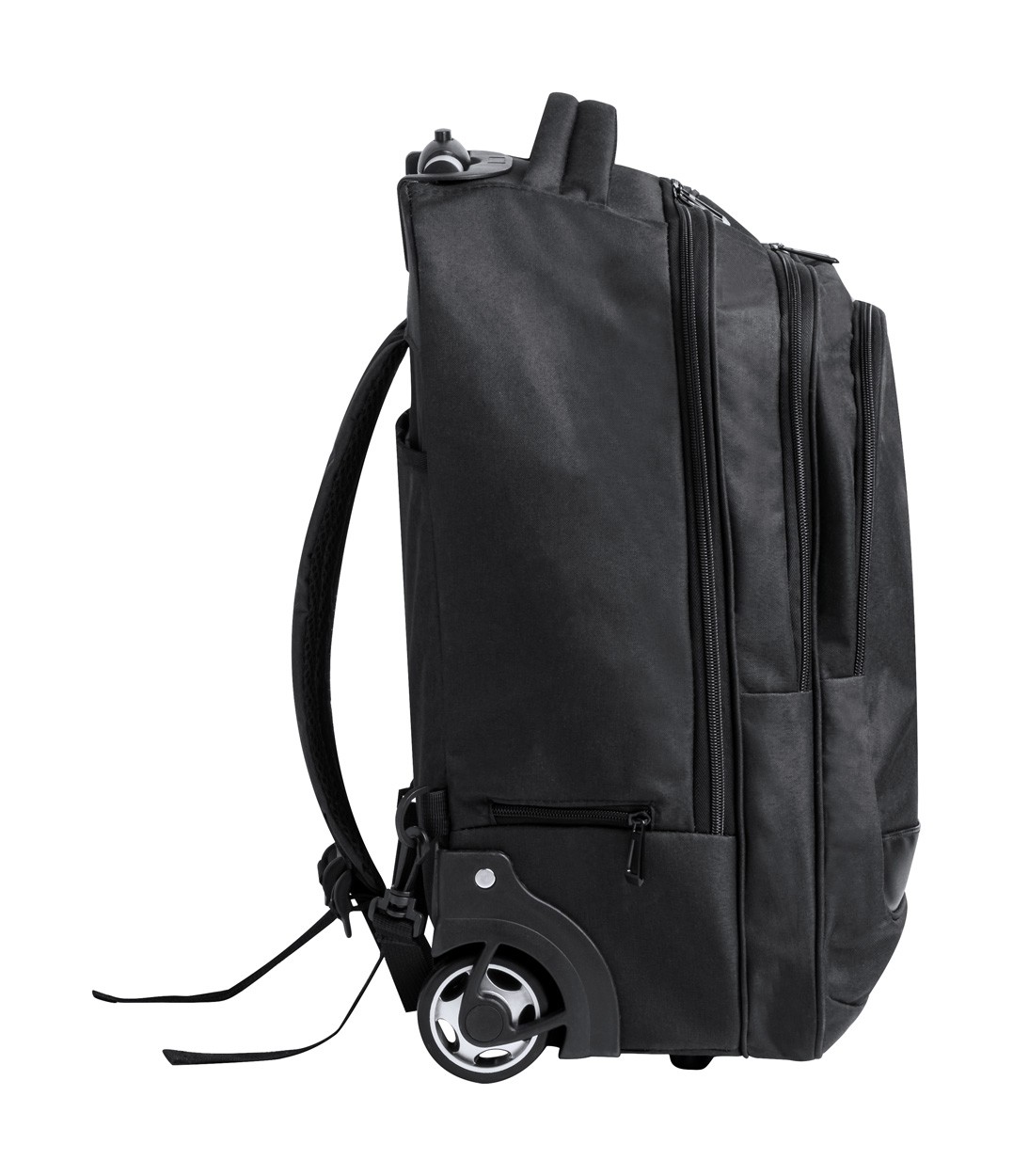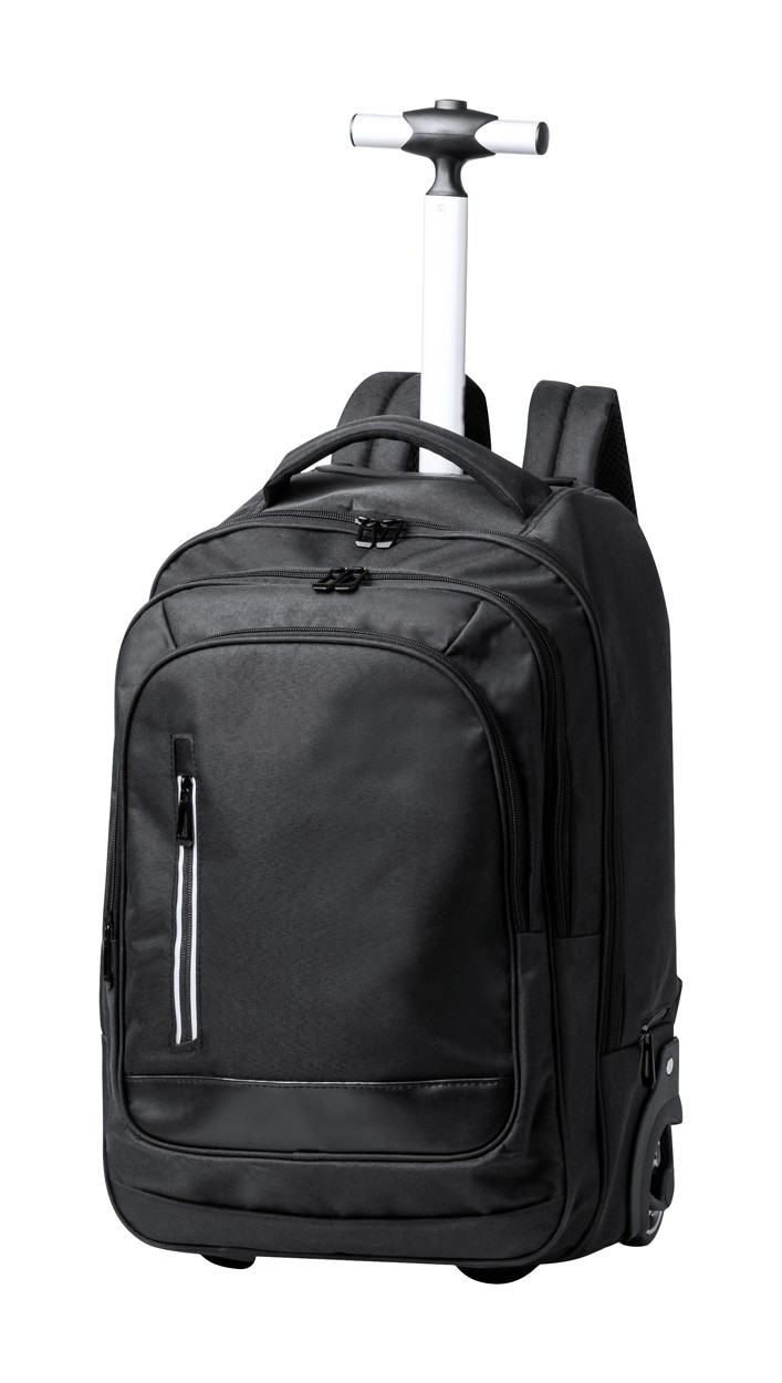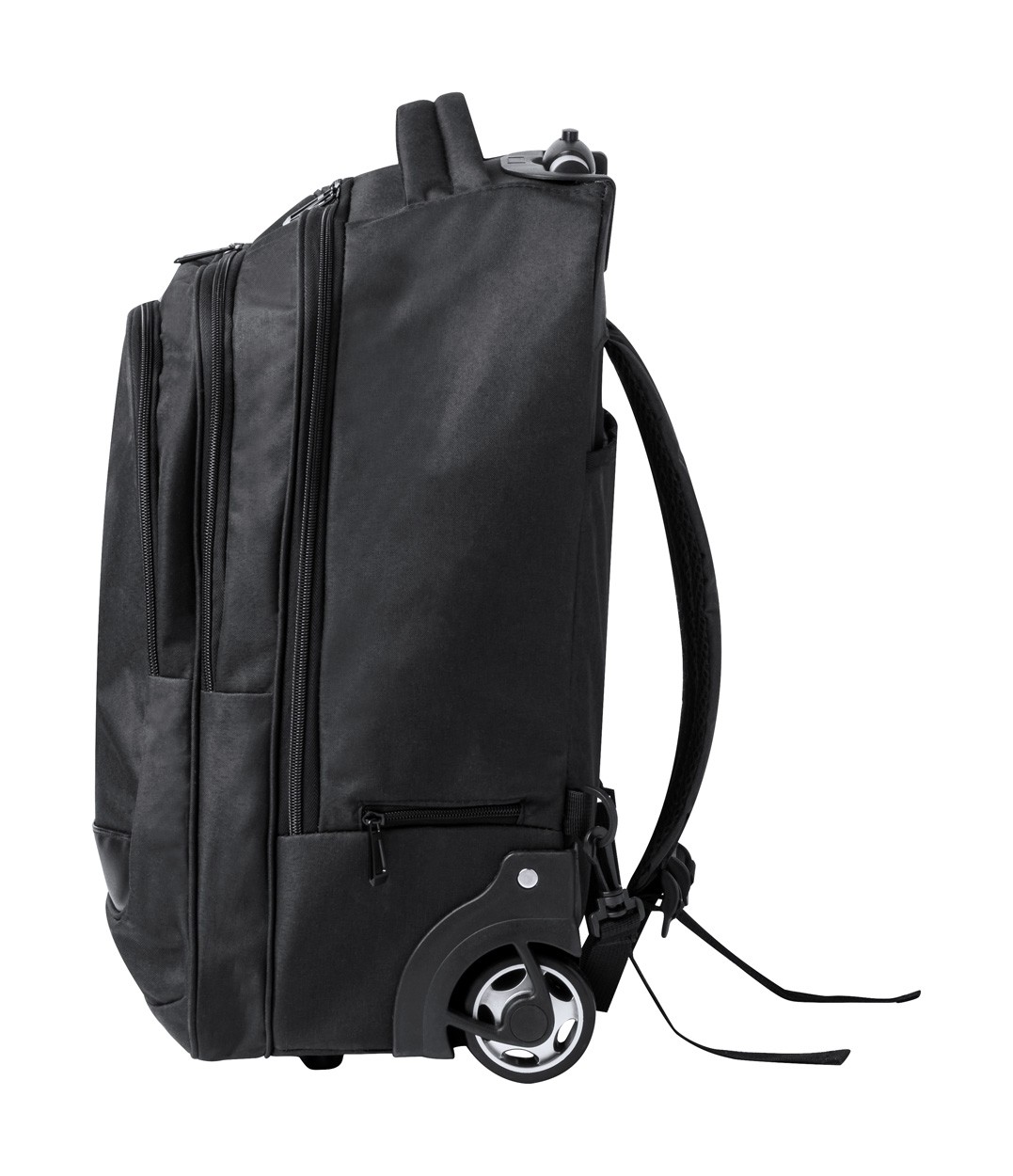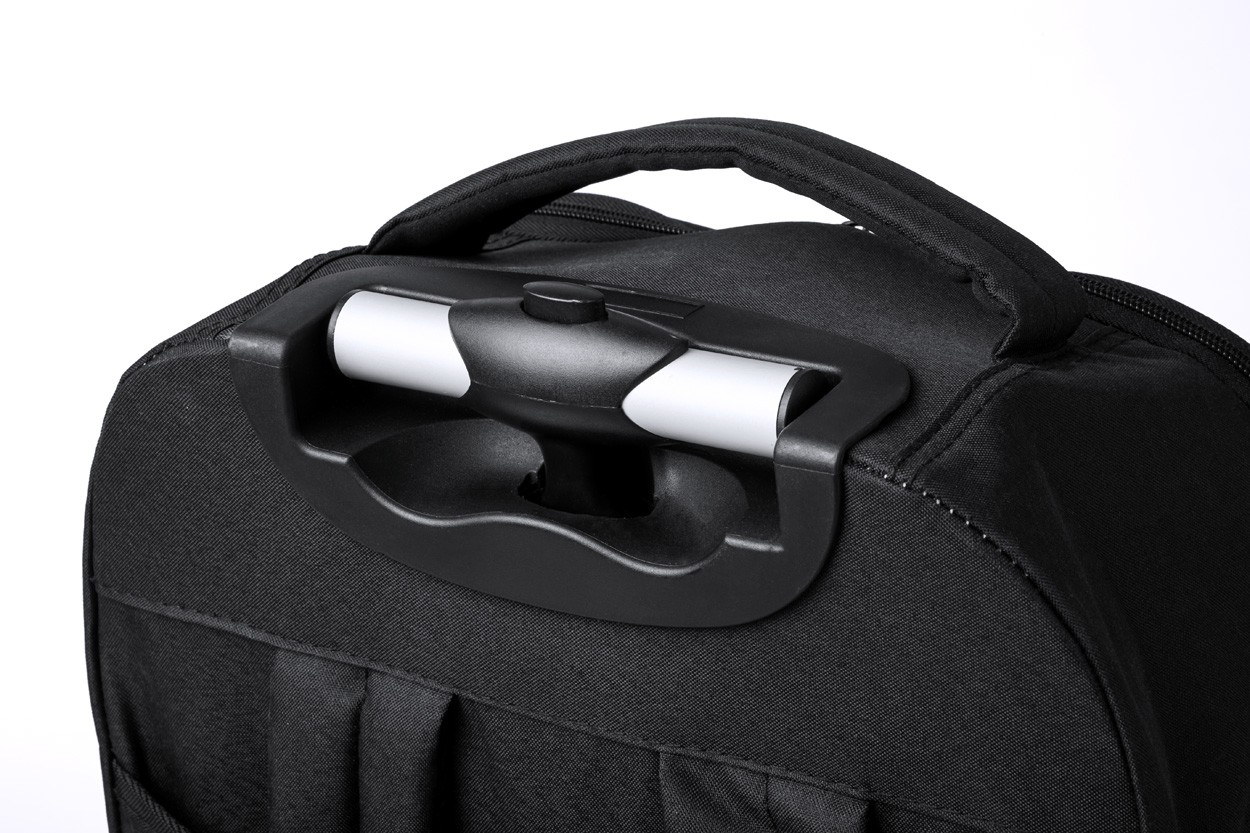 300D polyester trolley backpack with zipped compartments, 2 wheels and telescopic handle. With laptop (15") compartment, padded back and shoulder strap.