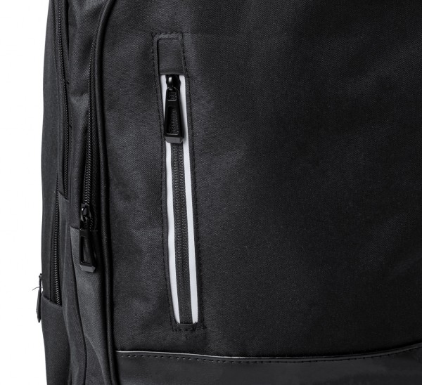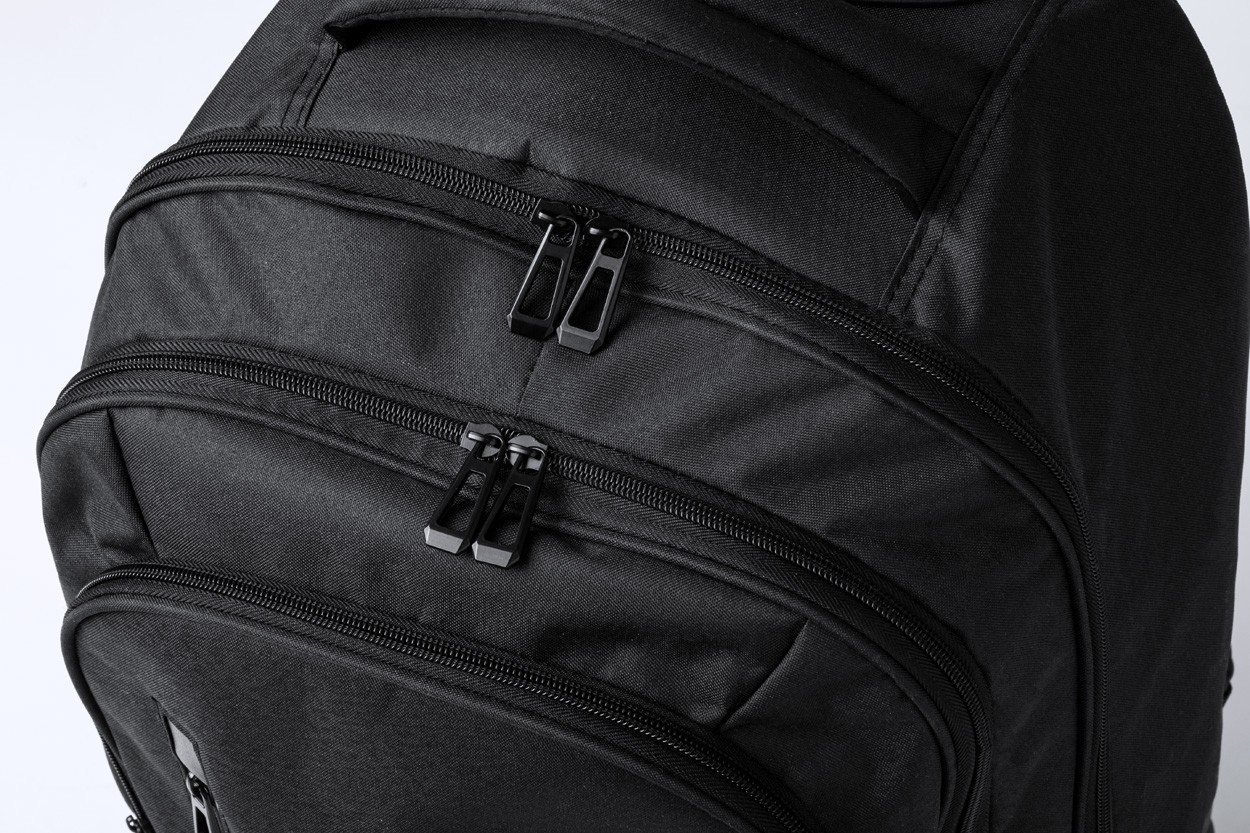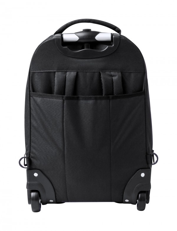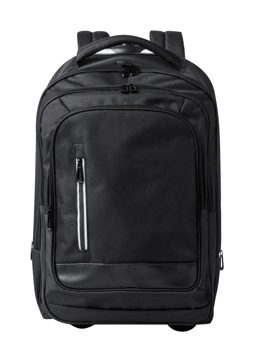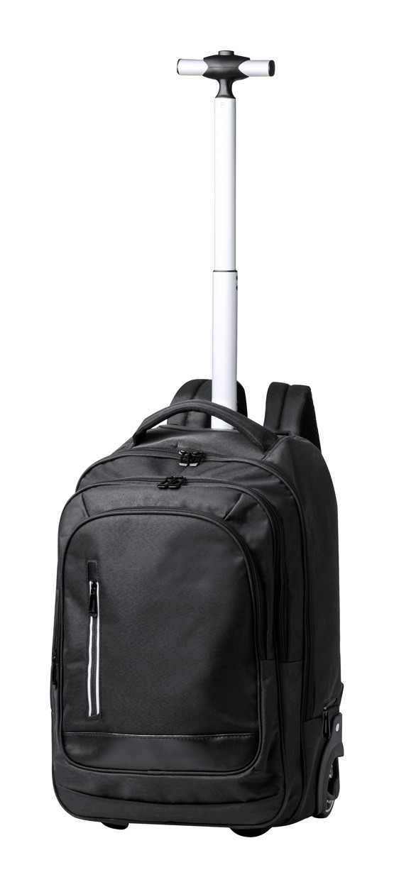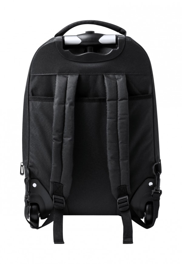 300D polyester trolley backpack with zipped compartments, 2 wheels and telescopic handle. With laptop (15") compartment, padded back and shoulder strap.
