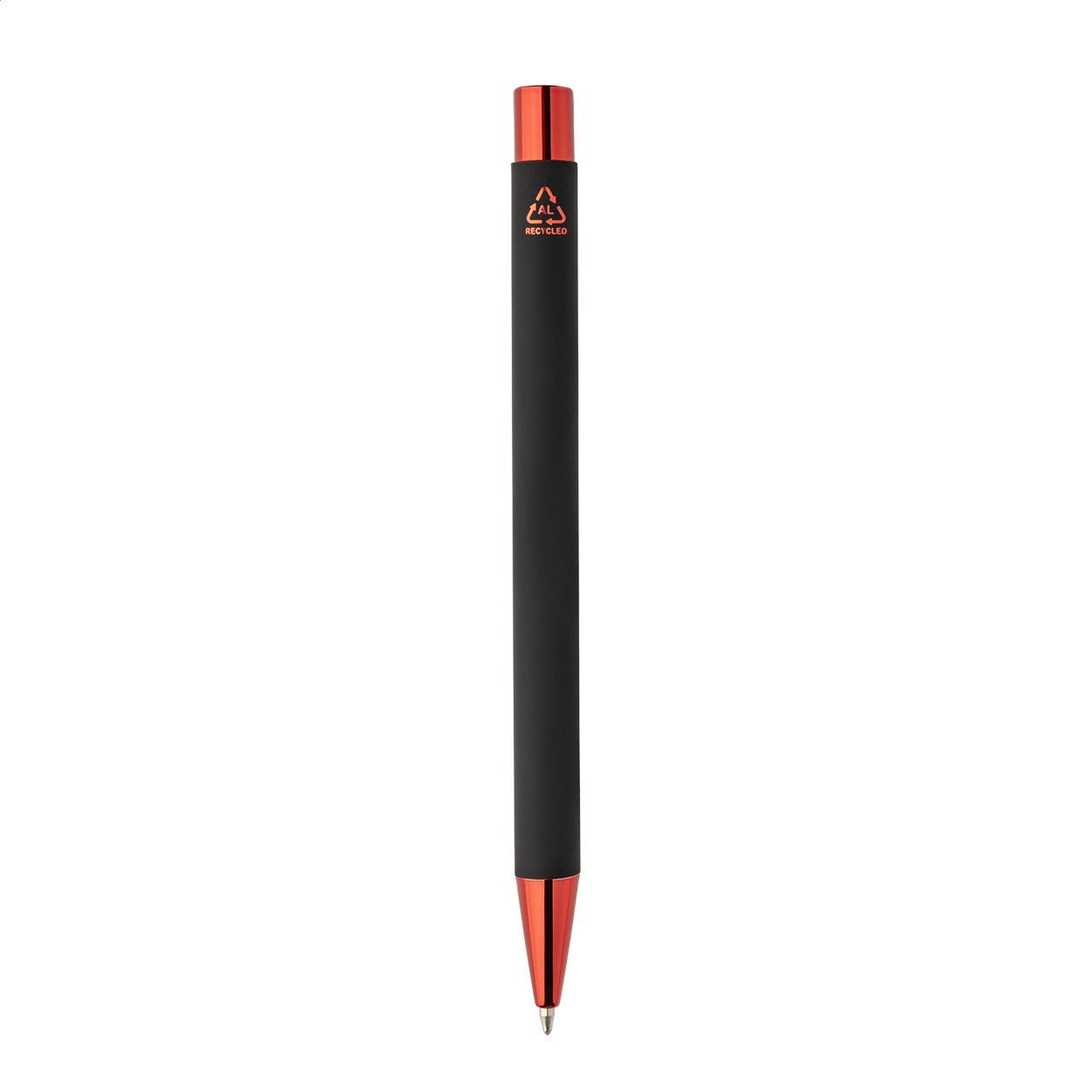 Pix din aluminiu reciclat, cu corp cauciucat negru și părți metalice colorate, cu finisaj lucios. Cu acoperire specială pentru gravură în oglindă, asortată cu părțile metalice. Cu mină albastră.