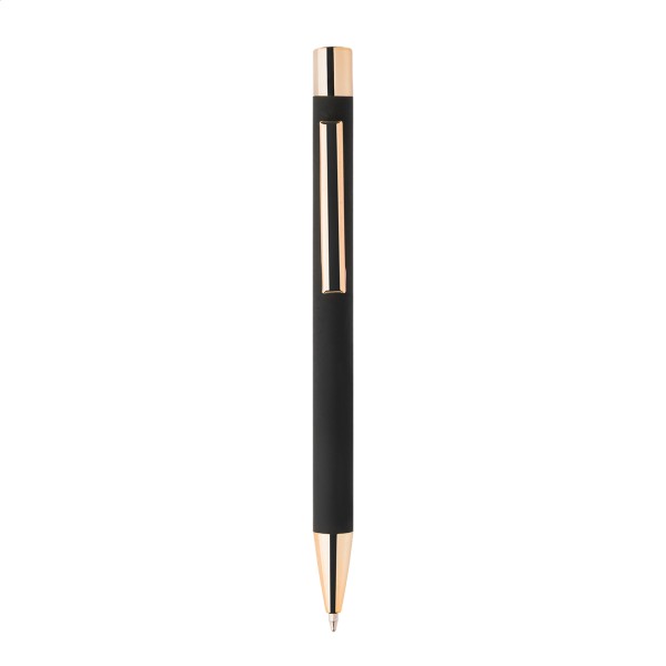 Pix din aluminiu reciclat, cu corp cauciucat negru și părți metalice colorate, cu finisaj lucios. Cu acoperire specială pentru gravură în oglindă, asortată cu părțile metalice. Cu mină albastră.