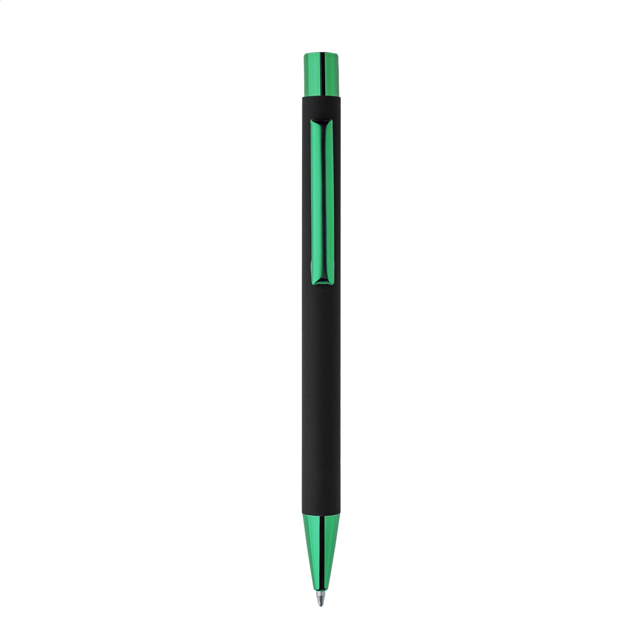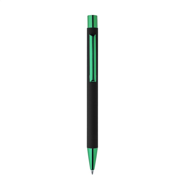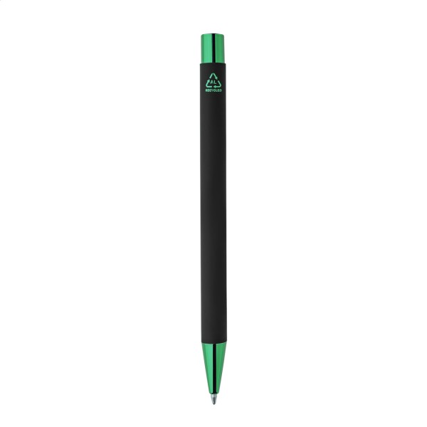 Pix din aluminiu reciclat, cu corp cauciucat negru și părți metalice colorate, cu finisaj lucios. Cu acoperire specială pentru gravură în oglindă, asortată cu părțile metalice. Cu mină albastră.