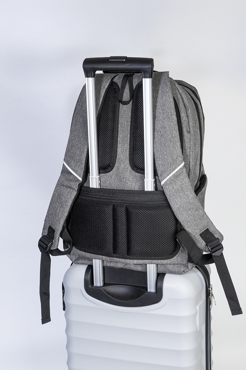 Rucsac RPET, cu compartimente cu fermoar, 2 buzunare frontale cu fermoar, buzunare laterale cu fermoar și compartiment căptușit pentru laptop (15"). Cu spate și curele căptușite, buzunar antifurt și curea pentru troler. Din poliester RPET 300D, cu etichetă RPET distinctivă.
