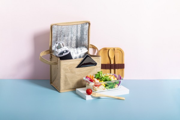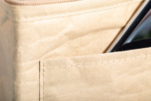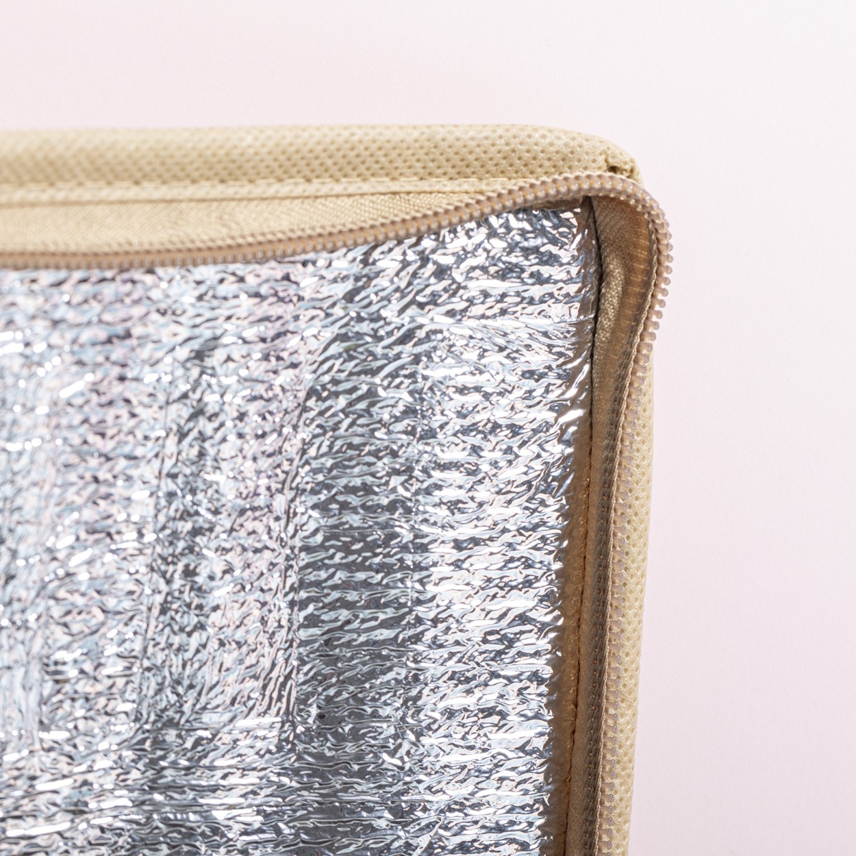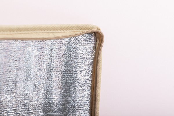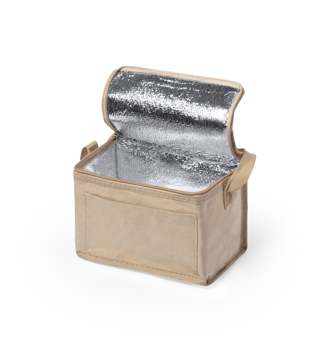 Geantă frigorifică, cu fermoar, din hârtie laminată reciclată, cu căptușeală din aluminiu, pentru 6 buc. cutii de 0,33 l. Cu buzunar frontal ideal pentru imprimare.