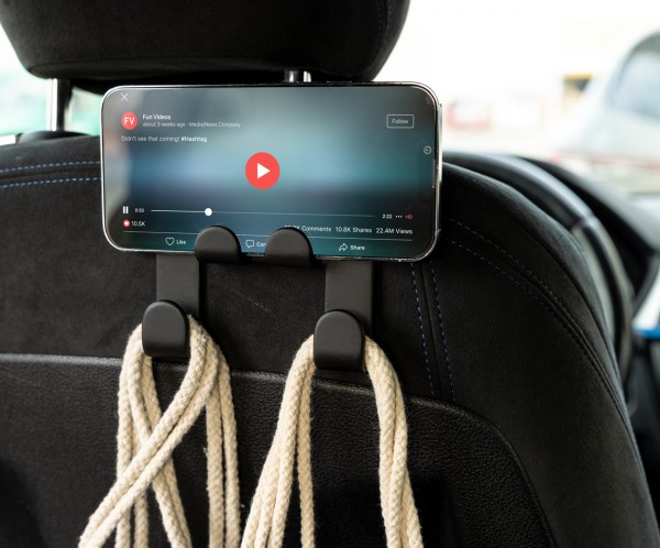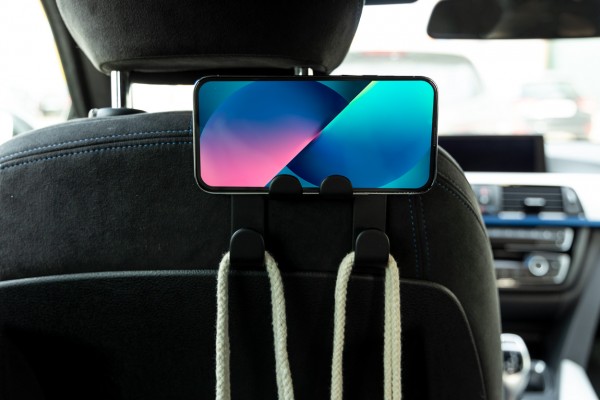 Suport auto pentru telefon mobil, din plastic ABS, cu 2 cârlige pentru genți.