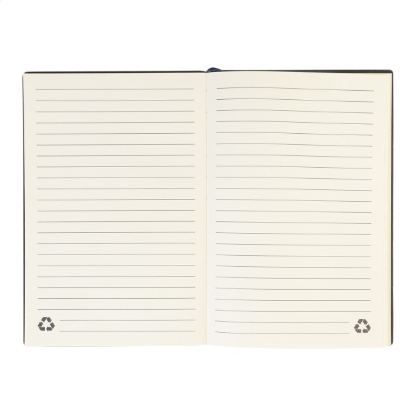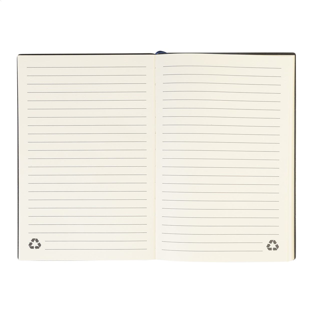 Caiet cu copertă din piele PU reciclată, cu decor în dungi și placă metalică cu logo. Cu semn de carte și 80 de file dictando din hârtie reciclată. Dimensiune A5.