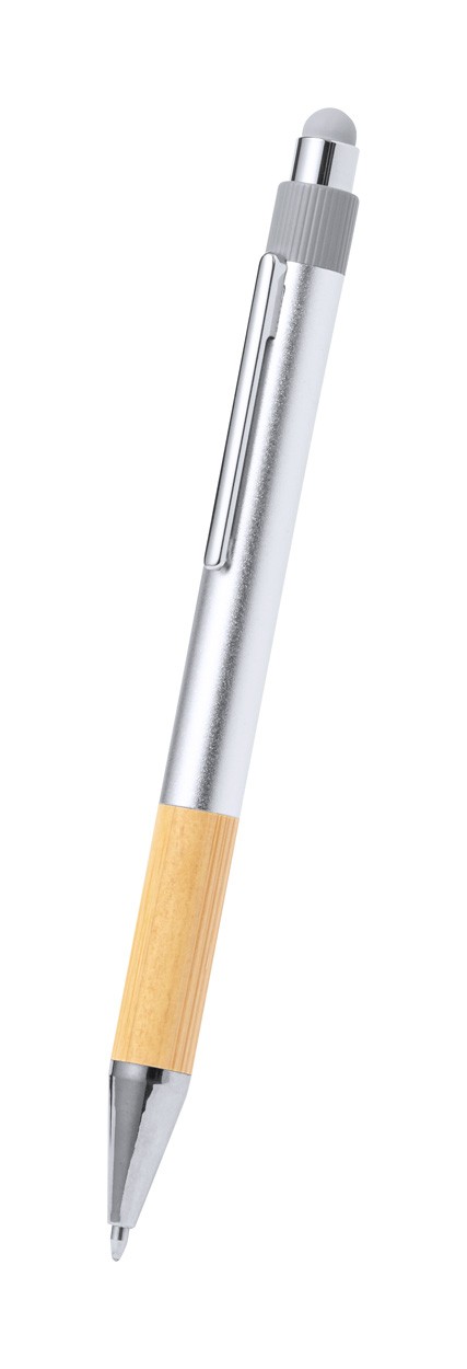 Pix din aluminiu reciclat, tactil, cu mâner din bambus, clemă metalică și mină albastră.
