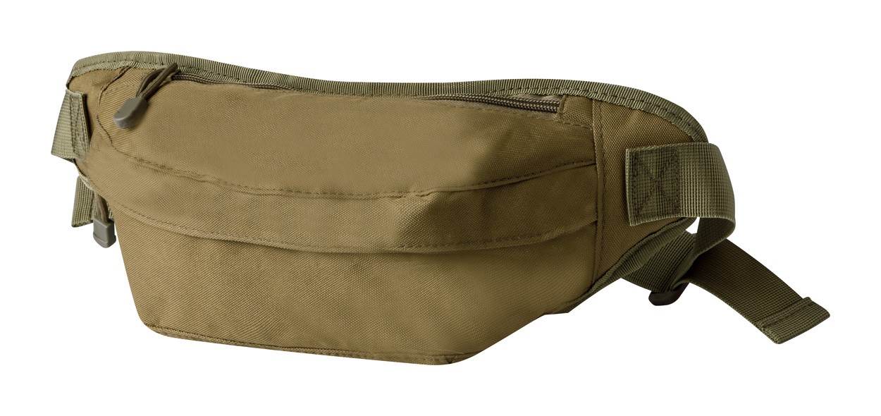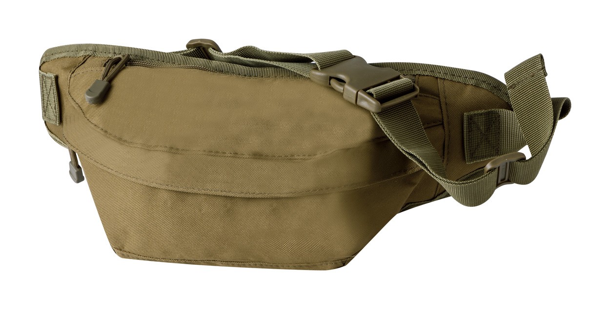 800D polyester waist bag with zipped compartments, adjustable strap and buckle closure.