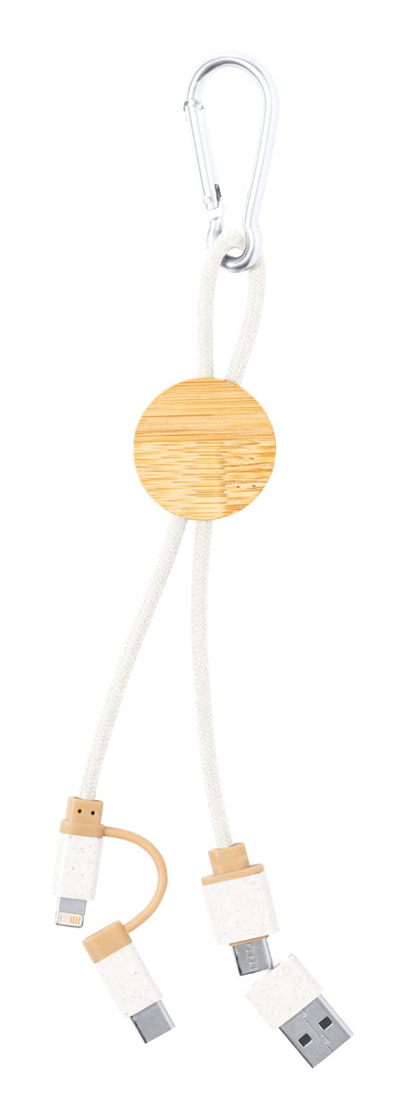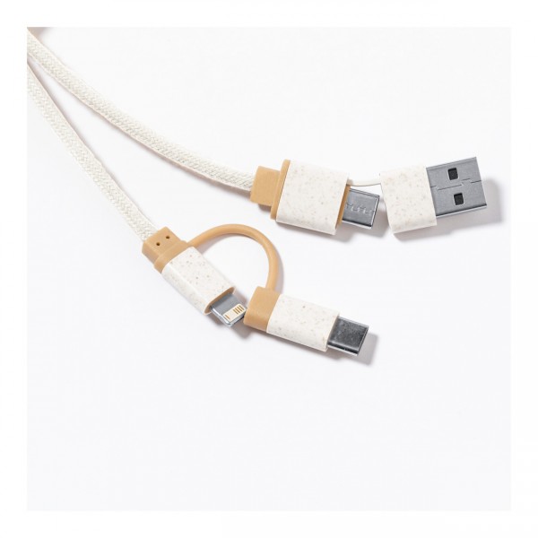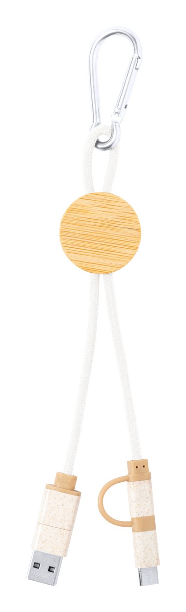 Cablu încărcare USB, din plastic ecologic din paie de grâu, bambus si bumbac, cu carabină. Cu conectori micro USB, USB-C și Lightning. Cu intrări USB și USB-C.