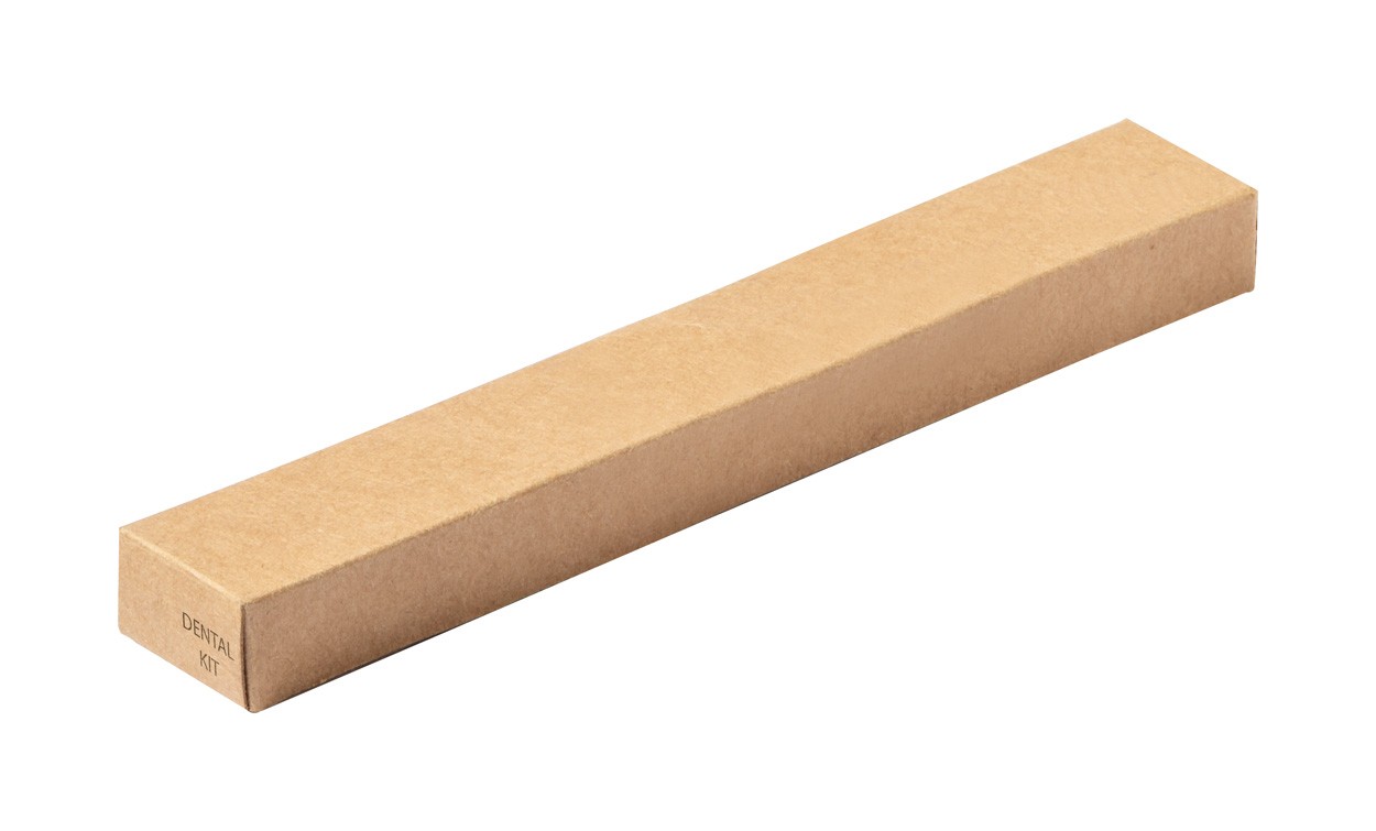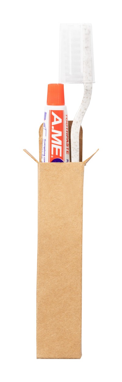 Set dentar,2 buc, include o periuță de dinți din plastic din paie de grâu cu peri albi și o pastă de dinți. În cutie de hârtie kraft.