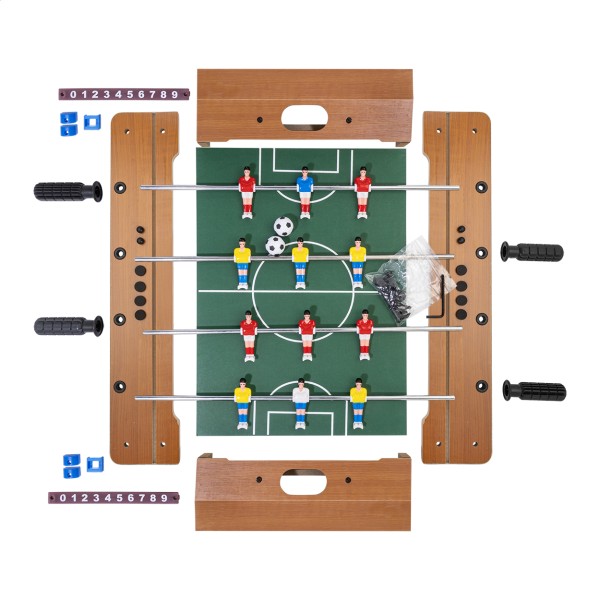 Mini joc de fotbal, de masă, din lemn MDF. Include 2 mingi și glisoare pentru scor. Livrat în pachet plat, necesită asamblare.
