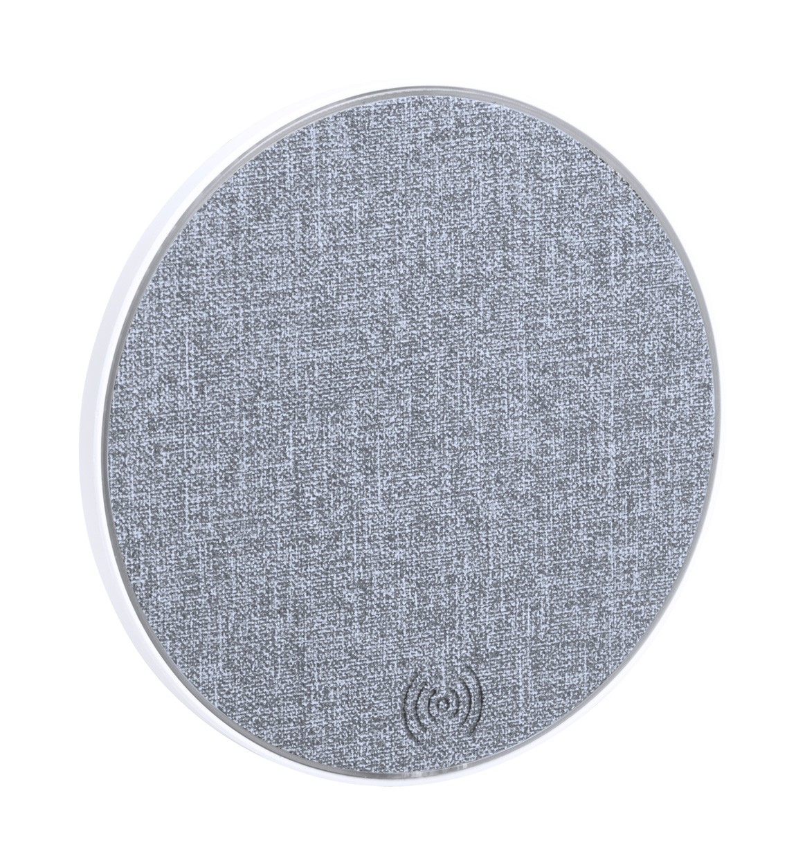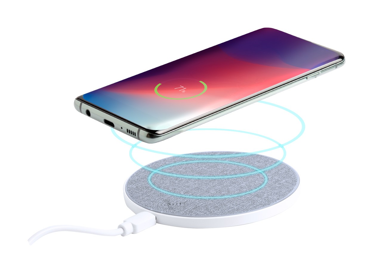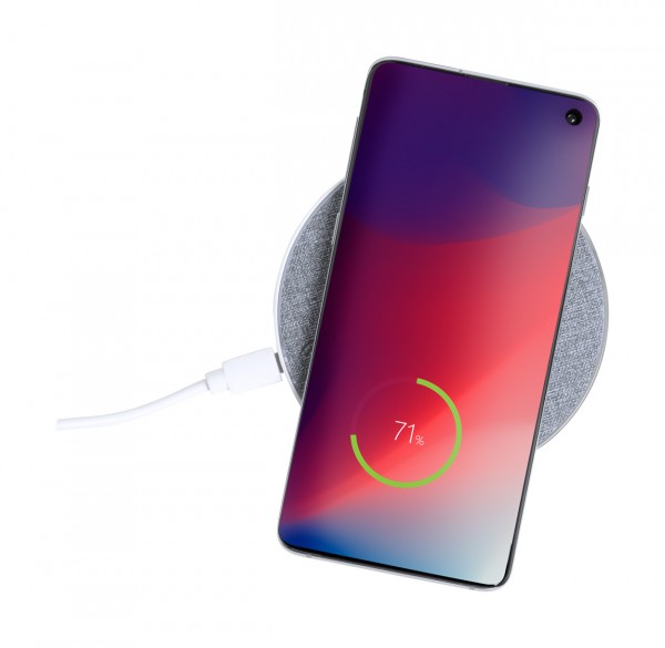 Încărcător wireless în carcasă din plastic cu înveliș din poliester. Putere maximă 1000 mA.