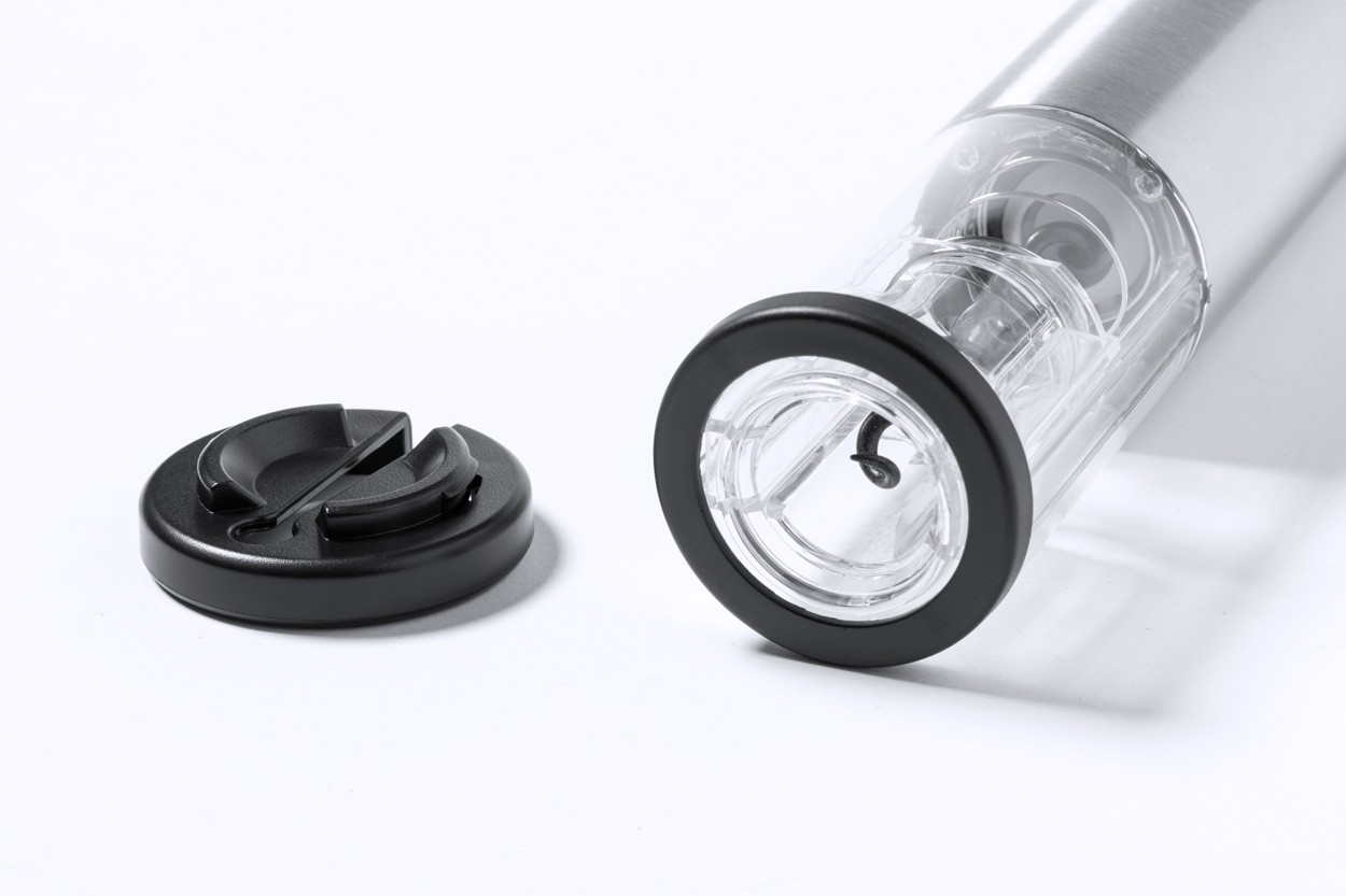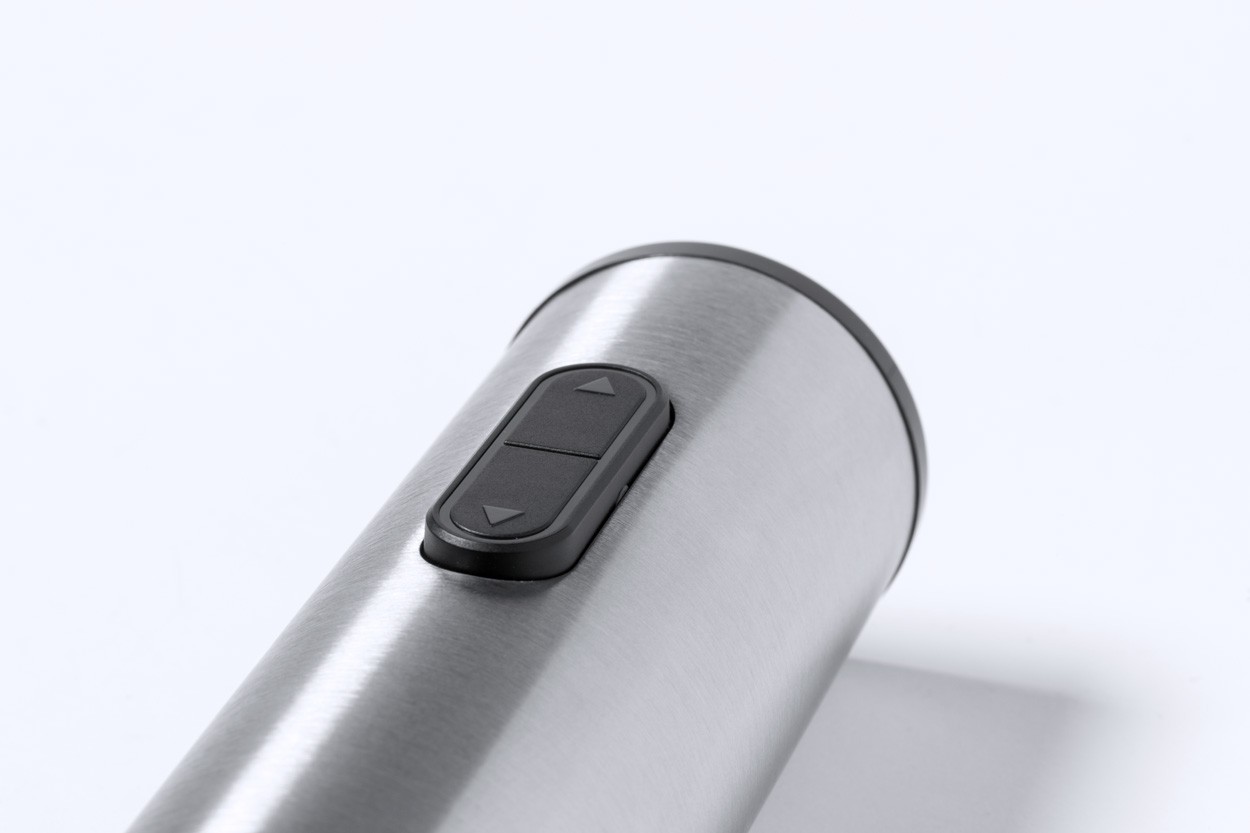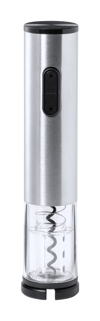 Tibușon electric din oțel inoxidabil și plastic ABS. Funcționează cu 4 baterii AA, se livrează fără baterii.