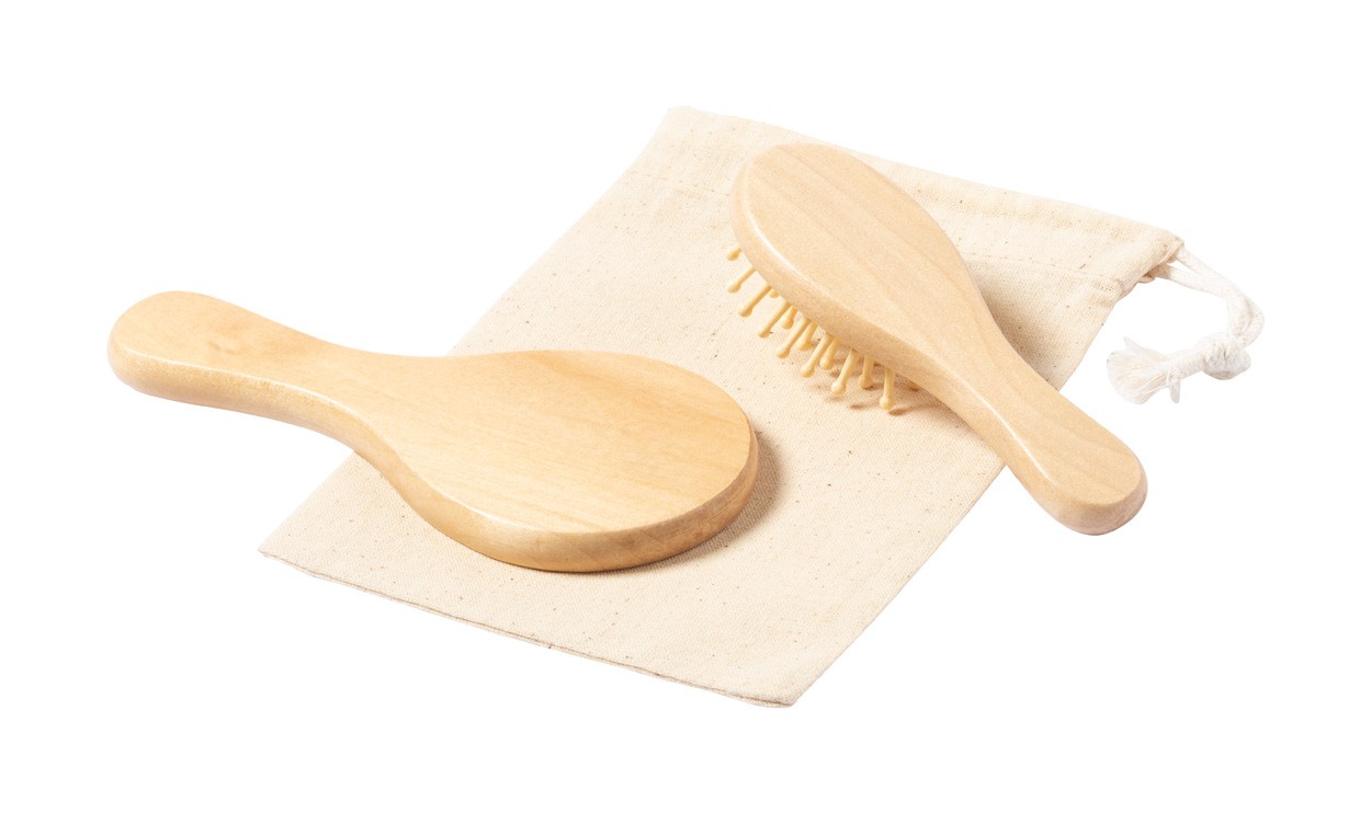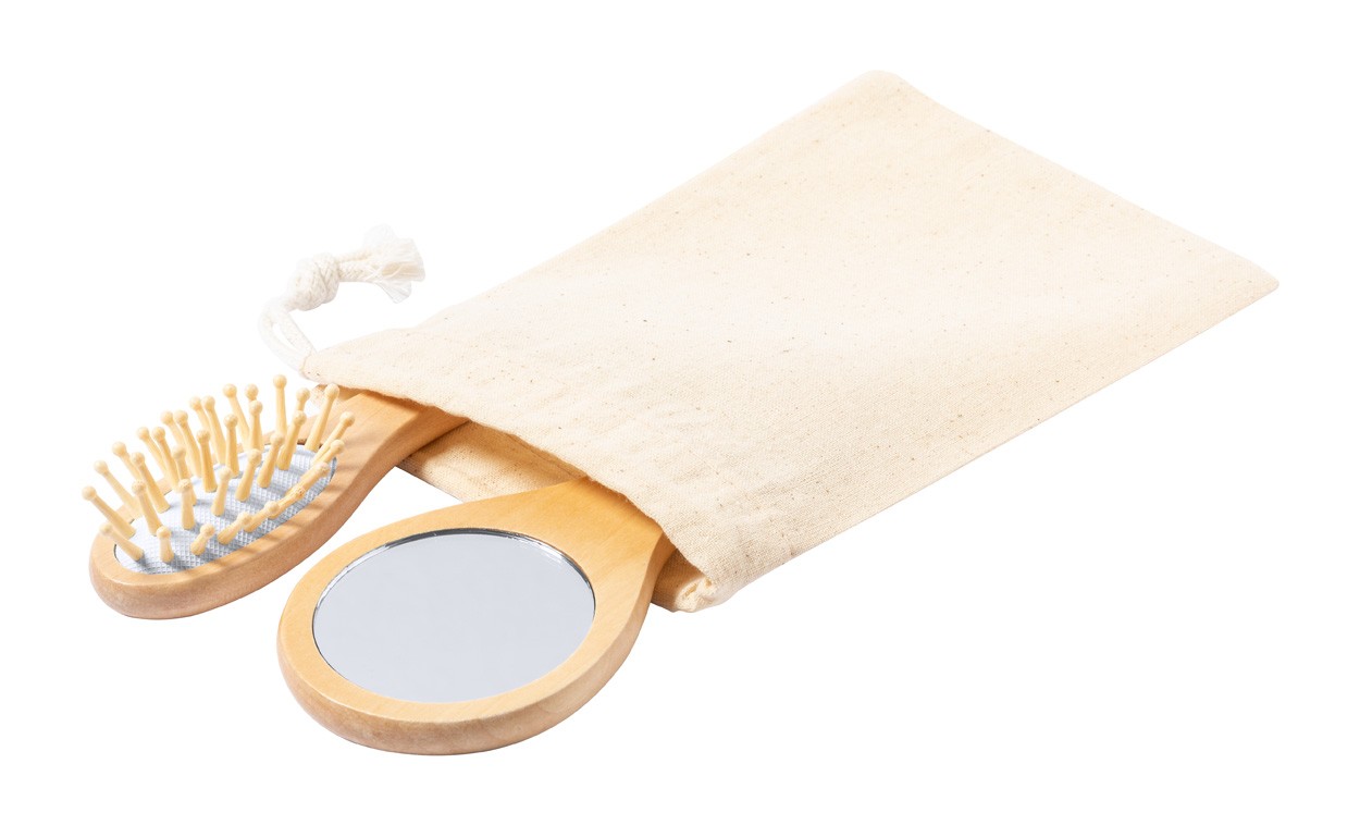 Perie pentru păr, din lemn, și oglindă cosmetică, în husă din bumbac cu șnur.