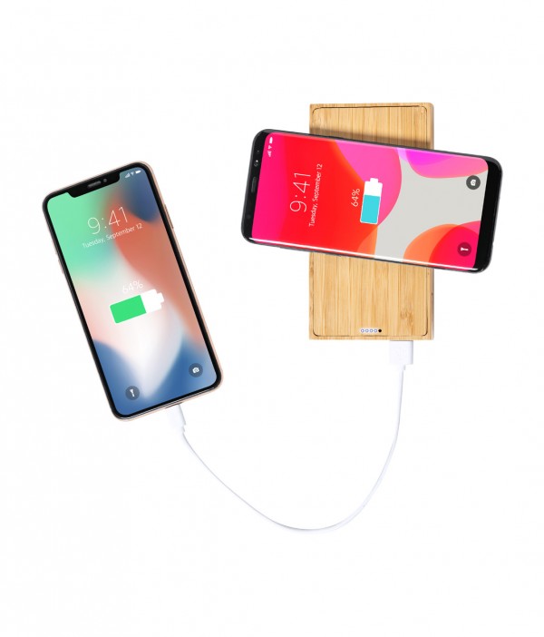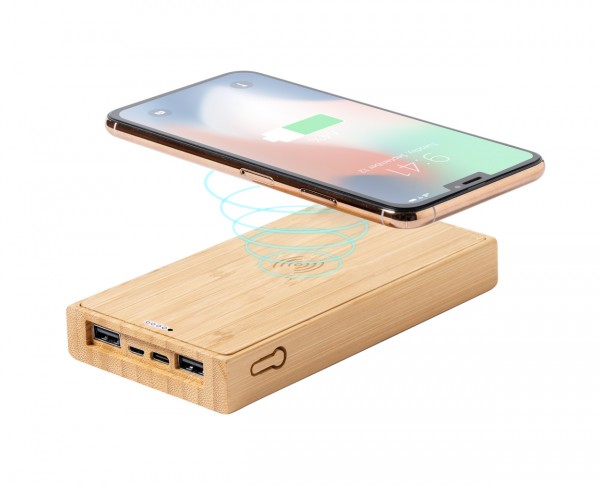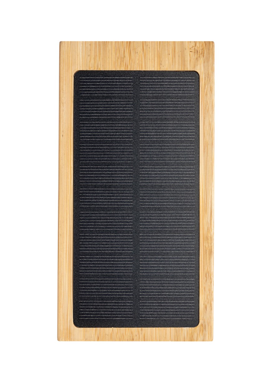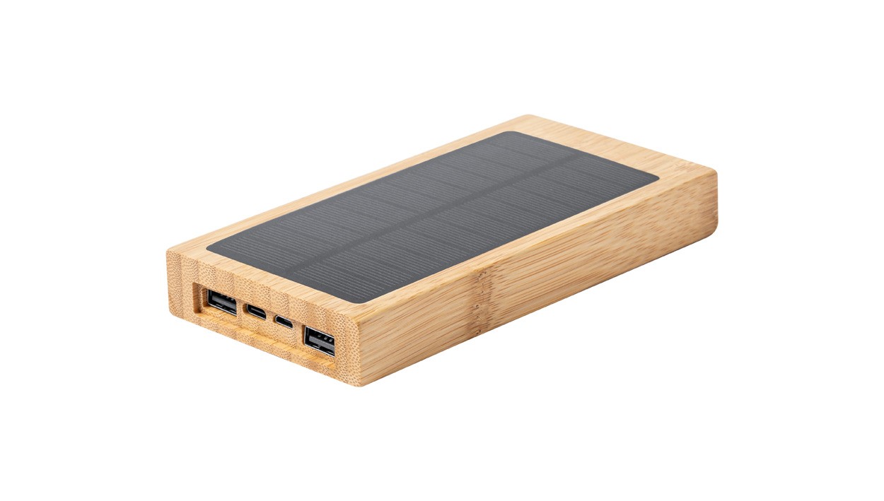 Baterie externă USB din bambus, cu încărcător wireless încorporat (5W), baterie de 10000 mAh și încărcător solar încorporat. 2 porturi USB pentru încărcător. Porturi de intrare micro USB și USB-C. Inclusiv cablu de încărcare USB. Fabricat din bambus din s