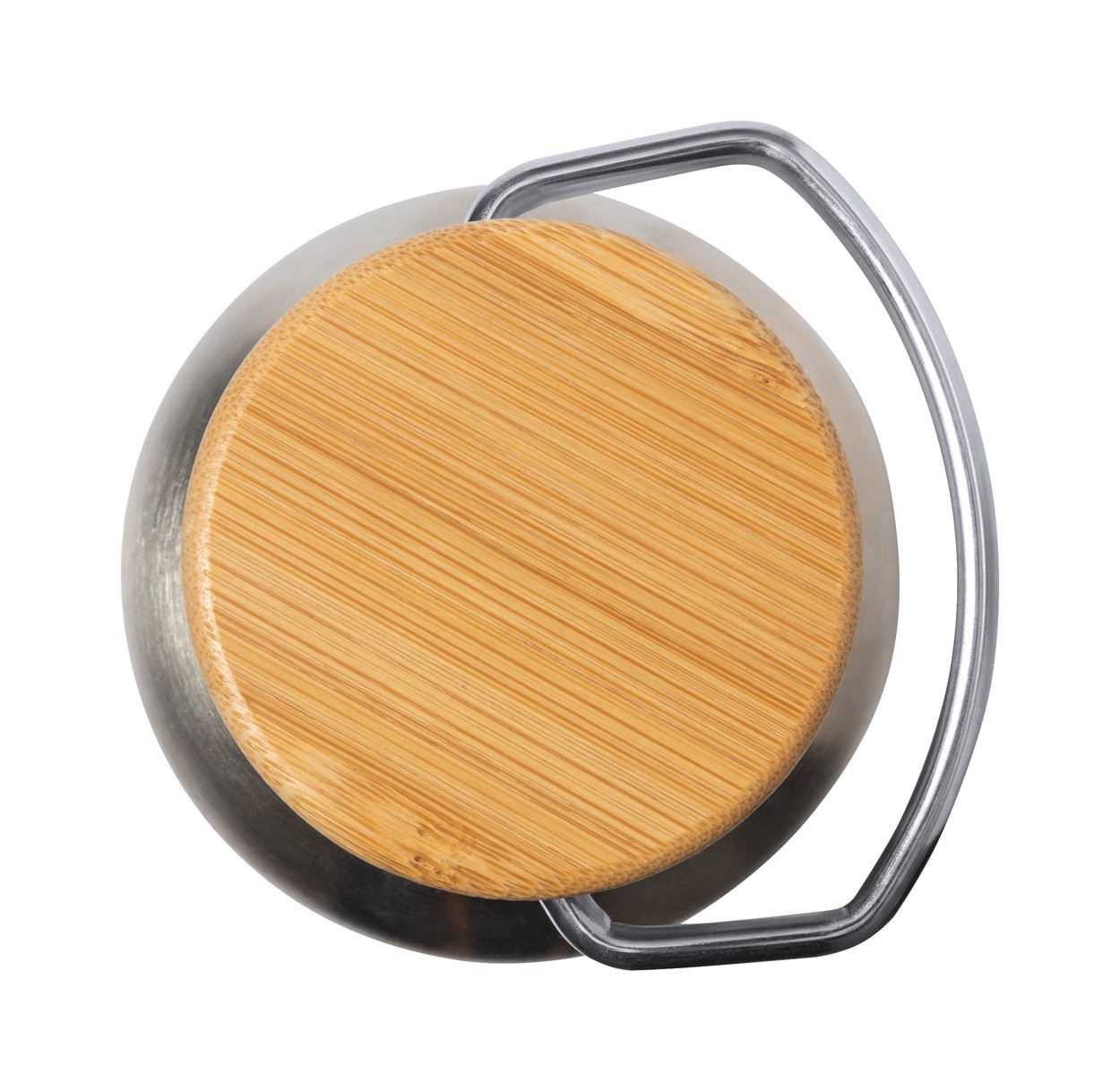 Termos din oțel inoxidabil, cu perete dublu, cu bază din plută naturală și capac de transport din bambus, 650 ml. Izolația menține băuturile calde timp de 6 ore și reci timp de 15 ore.
