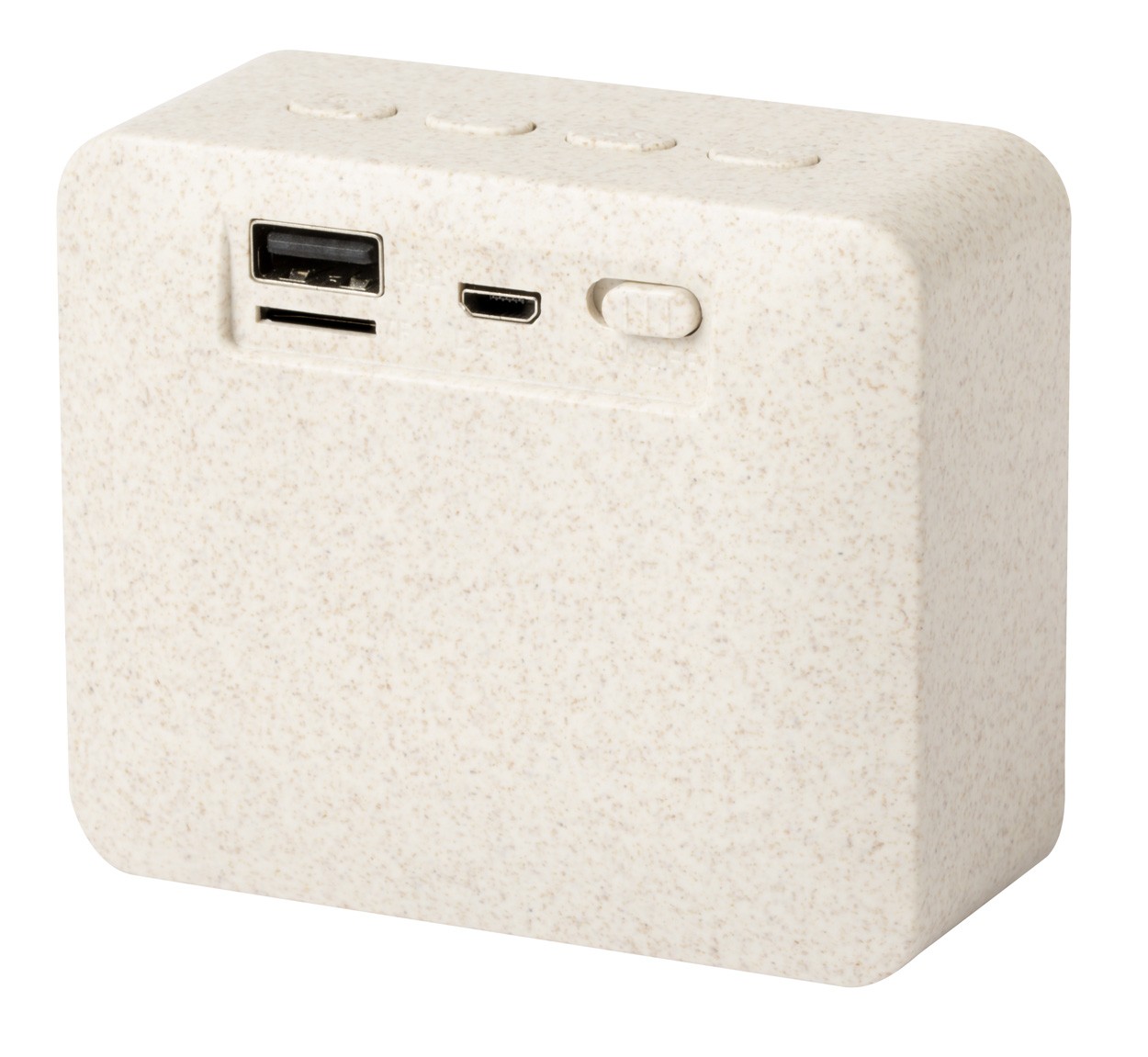 Difuzor wireless cu carcasă din plastic ecologic din paie de grâu și baterie reîncărcabilă. Funcții de redare USB și micro SD. Inclusiv cablu de încărcare USB.