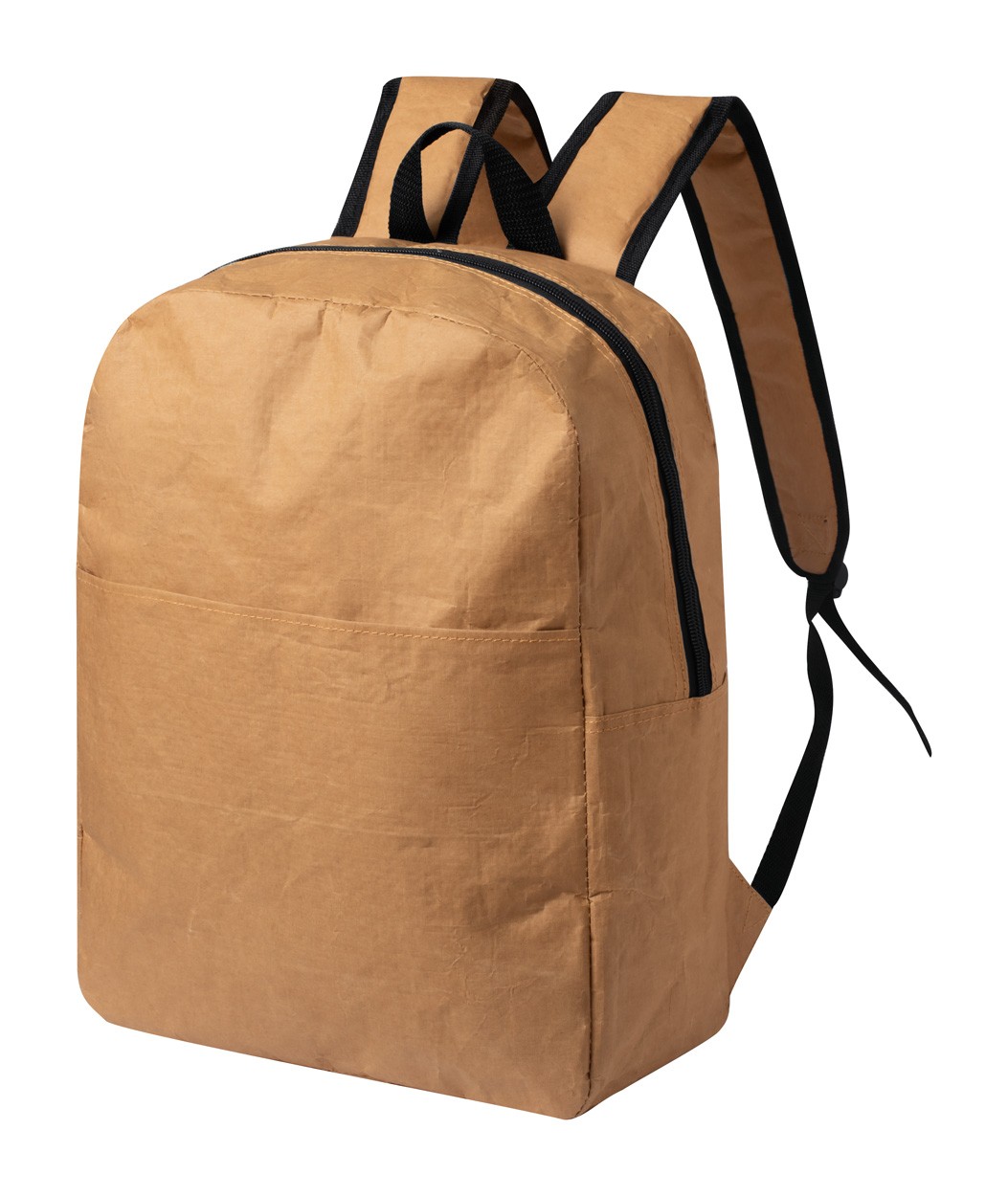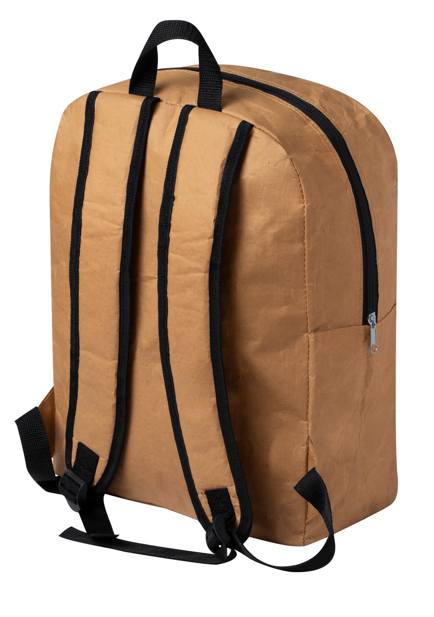 Rucsac din hârtie laminată kraft, cu compartiment cu fermoar și bretele reglabile.