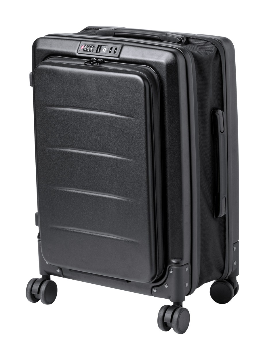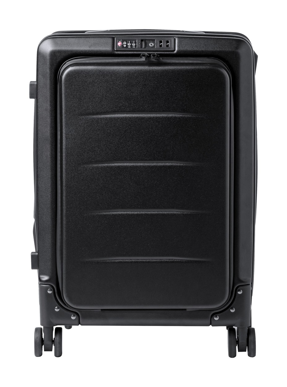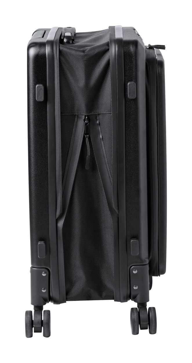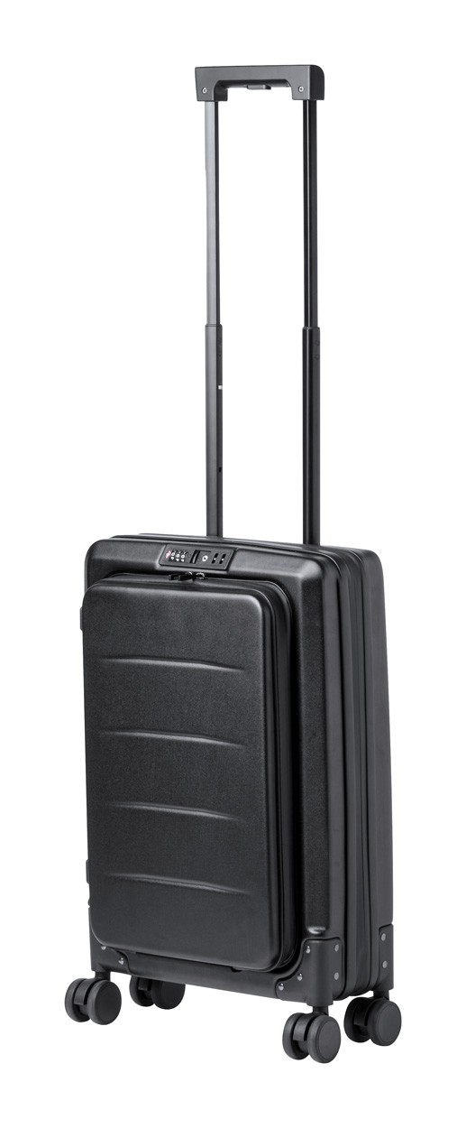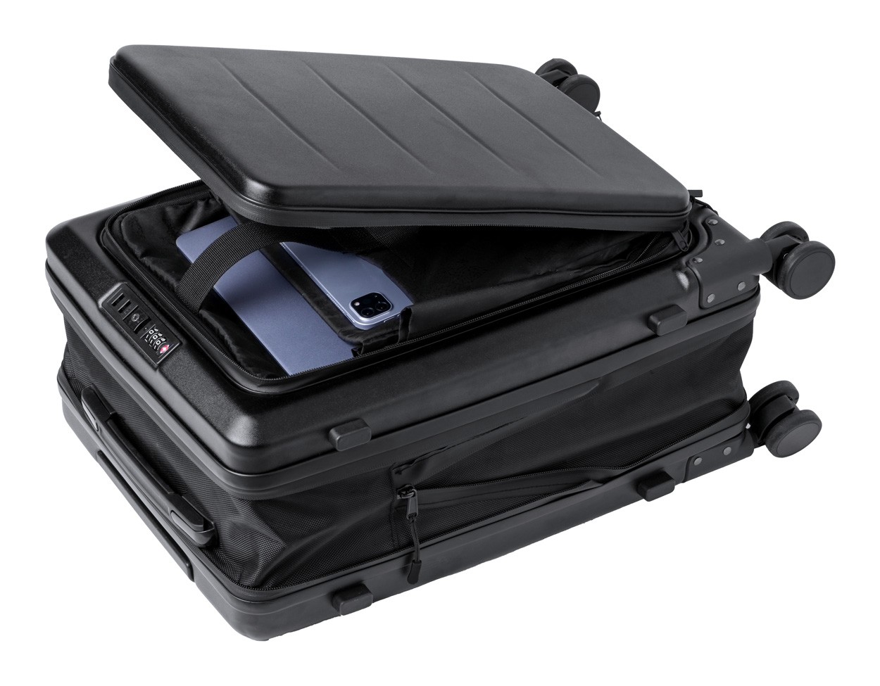 Foldable ABS plastic trolley bag with 4 wheels, telescopic handle and TSA combination lock. With elastic fastening straps, padded laptop (15") and tablet (10") compartments.