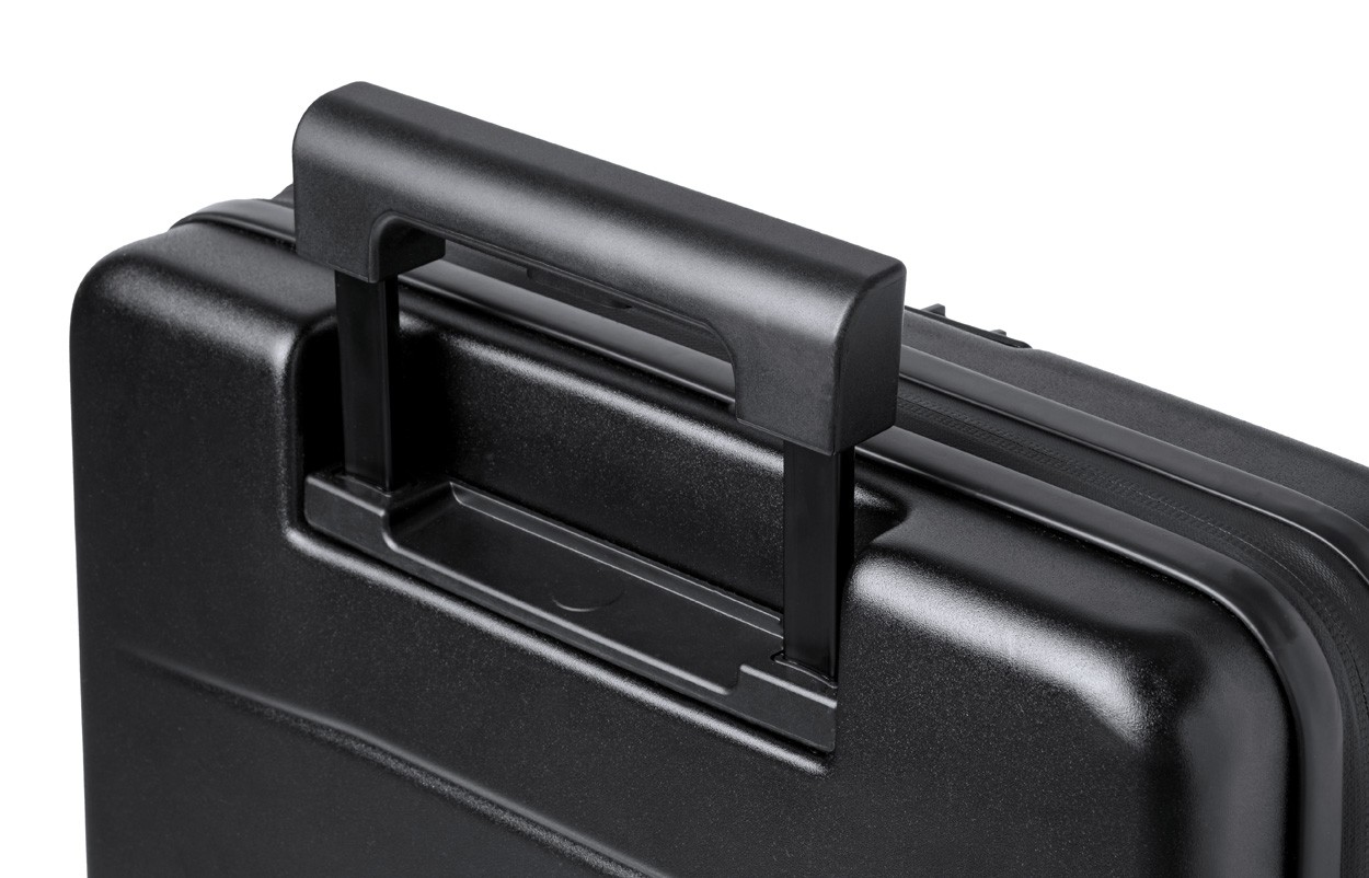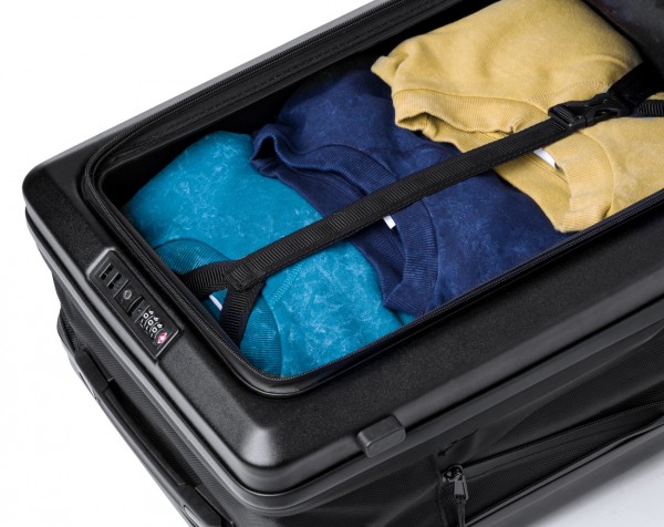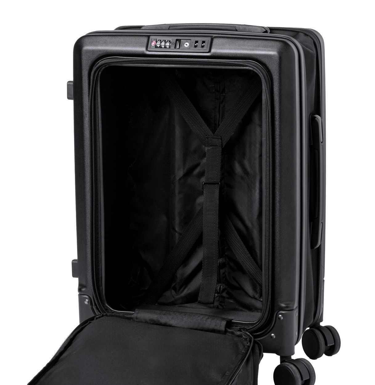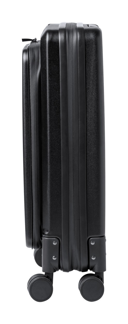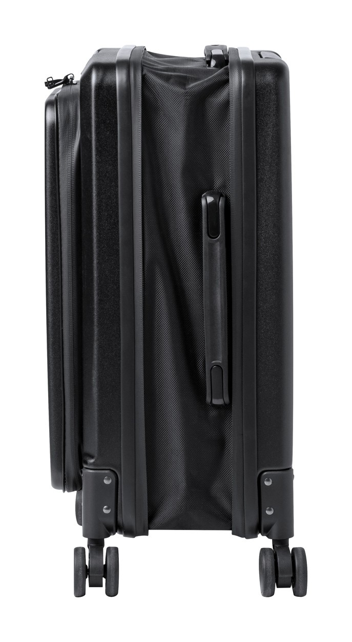 Foldable ABS plastic trolley bag with 4 wheels, telescopic handle and TSA combination lock. With elastic fastening straps, padded laptop (15") and tablet (10") compartments.