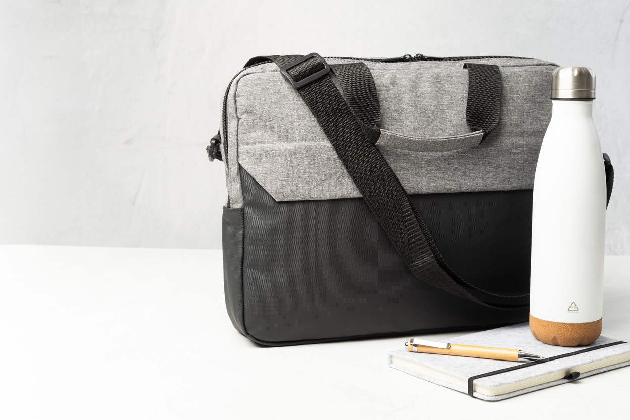 Geantă impermeabilă pentru documente și laptop, căptușită, RPET, cu compartiment principal cu fermoar, buzunar frontal cu fermoar și curea de umăr reglabilă. Se potrivește laptopurilor de până la 15". Poliester 600D RPET acoperit cu PU cu etichetă RPET distinctă.