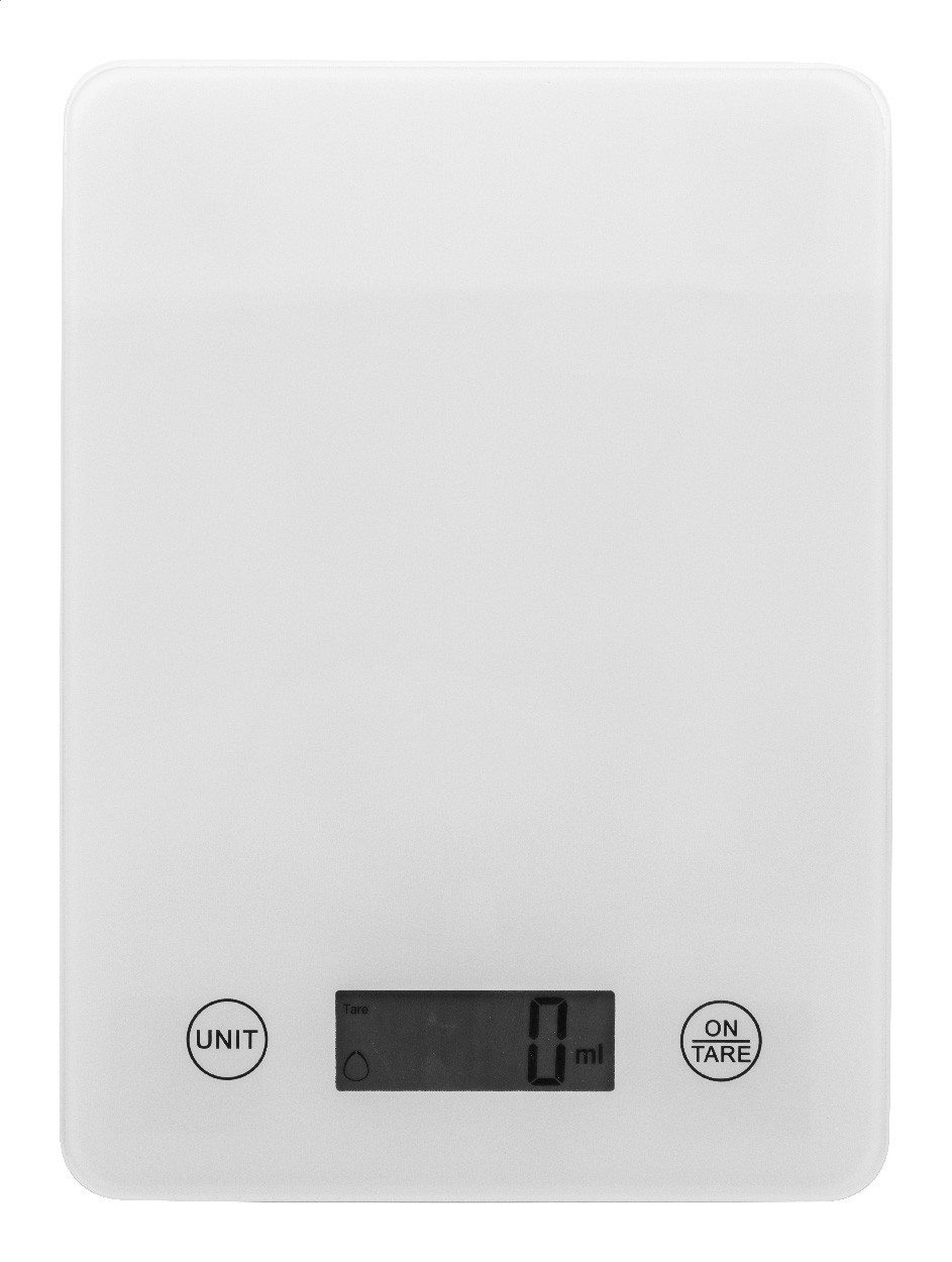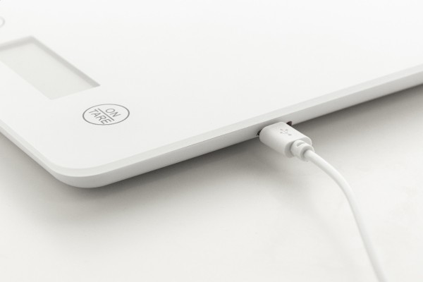 Cântar de bucătărie digital, cu platformă de cântărire din sticlă securizată și baterie reîncărcabilă USB încorporată (200 mAh). Capacitate: 5 kg, gradație 1 g, unități de măsură: g/oz. Cu indicator apă/lapte ml. Include cablu de încărcare USB.