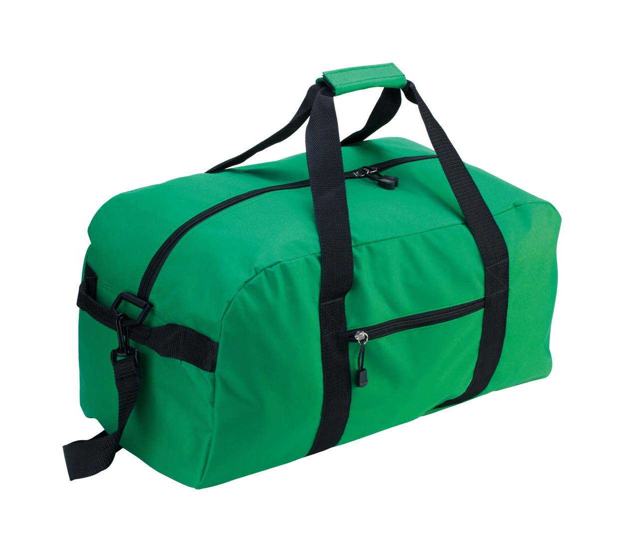 Geantă sport cu curea de umăr şi buzunare cu fermoar. Poliester 600D.