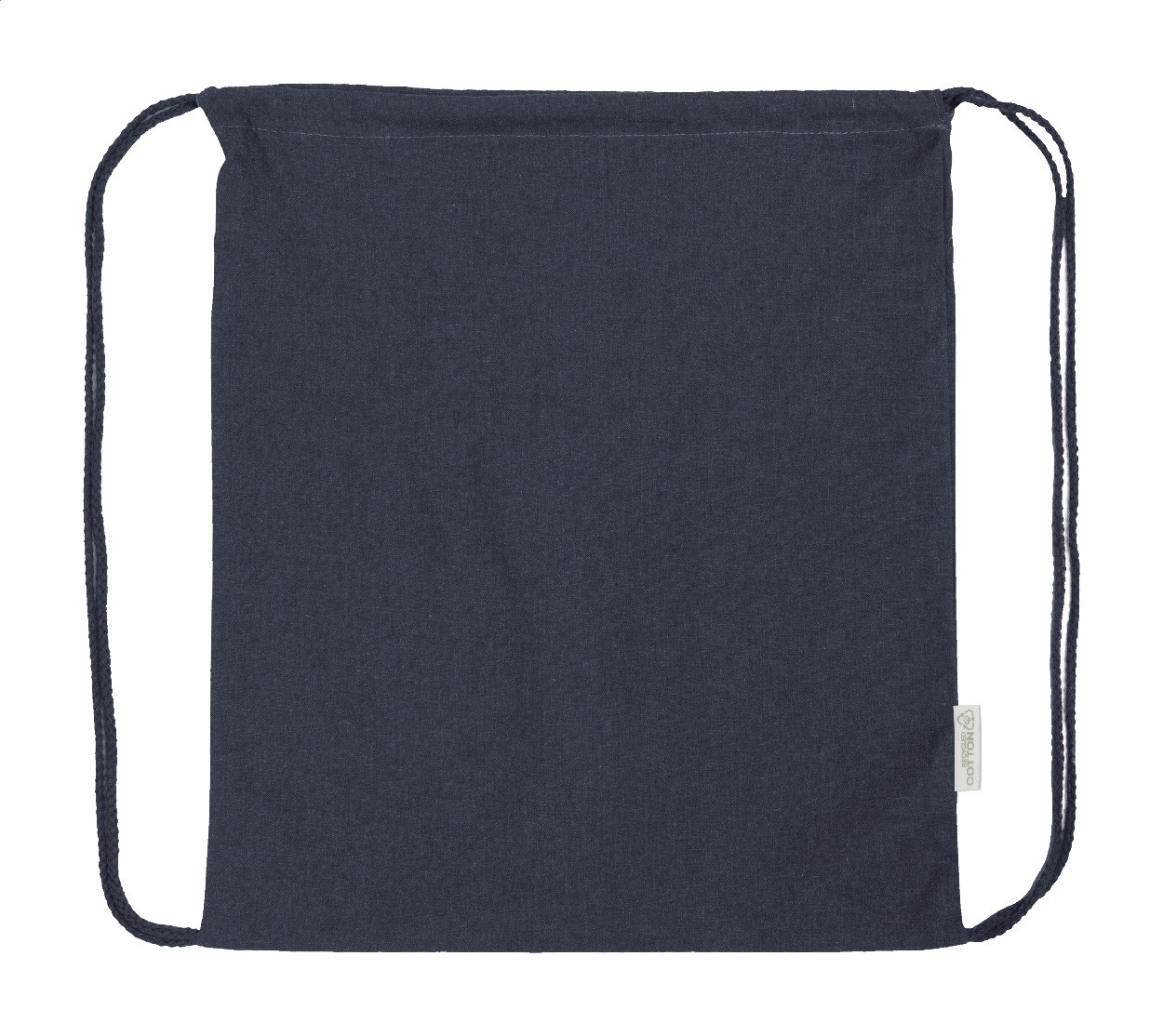 Rucsac cu șnur, din 70% bumbac reciclat și 30% poliester RPET, 140 g/m². Cu etichetă distinctivă din bumbac reciclat.
