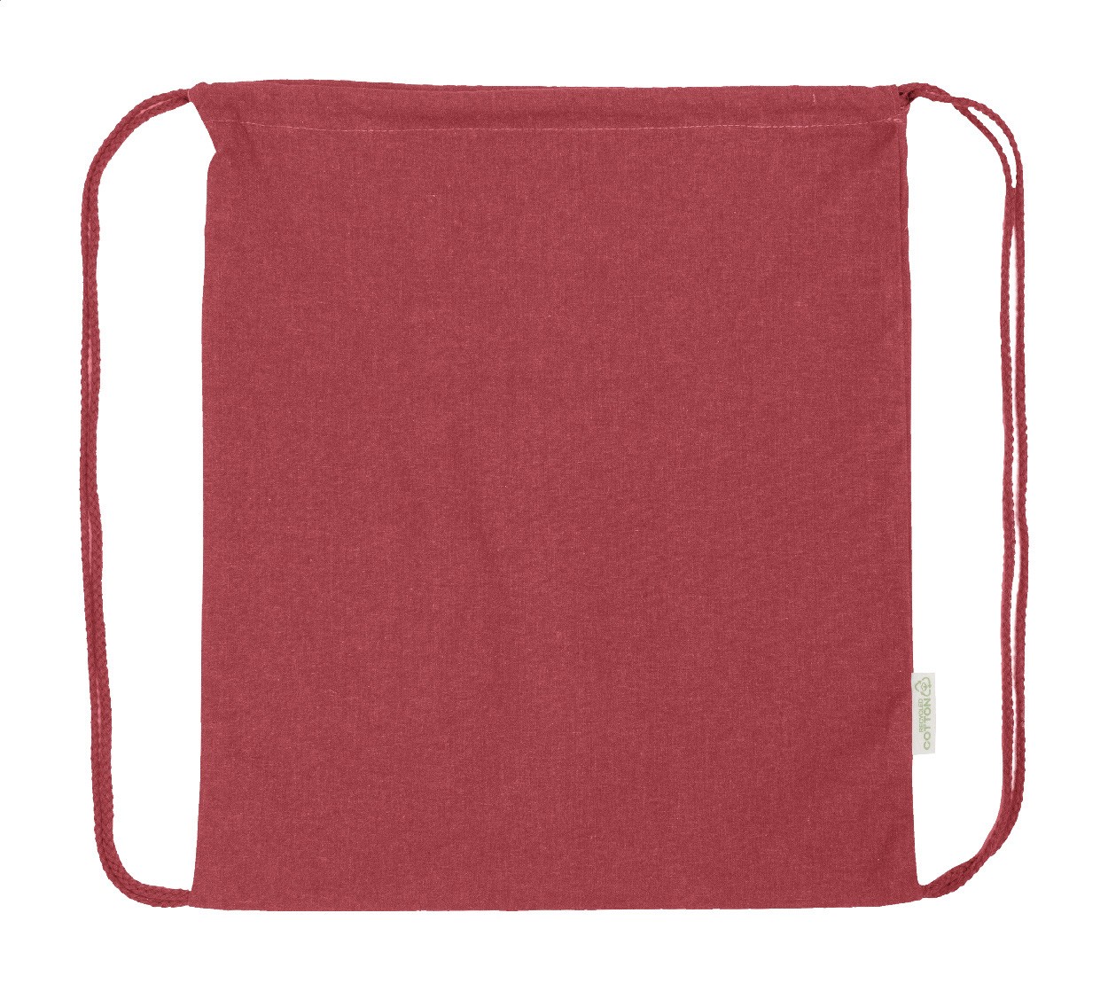 Rucsac cu șnur, din 70% bumbac reciclat și 30% poliester RPET, 140 g/m². Cu etichetă distinctivă din bumbac reciclat.