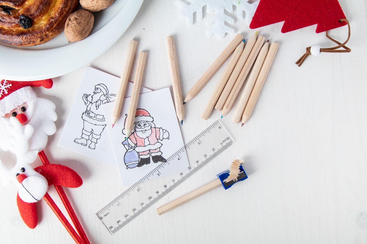 Set pentru desen cu 10 buc creioane colorate, 1 buc ascuțitoare, 1 buc riglă și 1 buc carte de colorat.