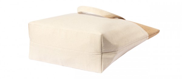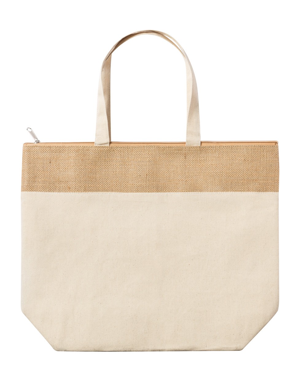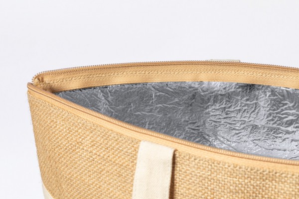 Geantă frigorifică pentru cumpărături 100% bumbac și iută laminată, cu căptușeală din aluminiu și compartiment cu fermoar.