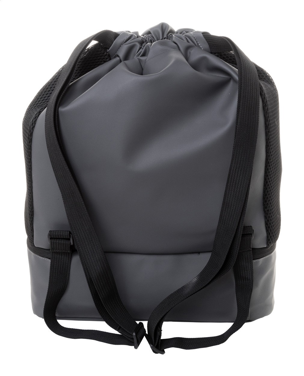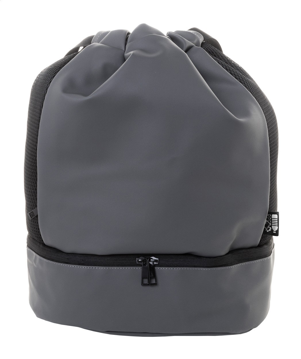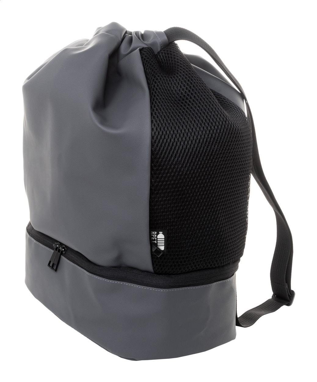 Rucsac premium, RPET, cu șnur, cu compartiment pentru pantofi cu fermoar, incrustații laterale din plasă și bretele largi. Poliester 600D RPET acoperit cu PU cu etichetă RPET distinctă.