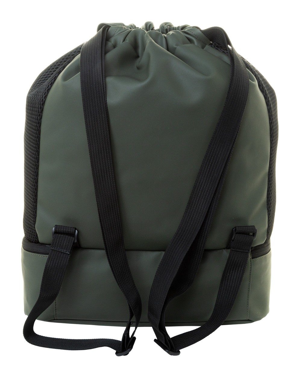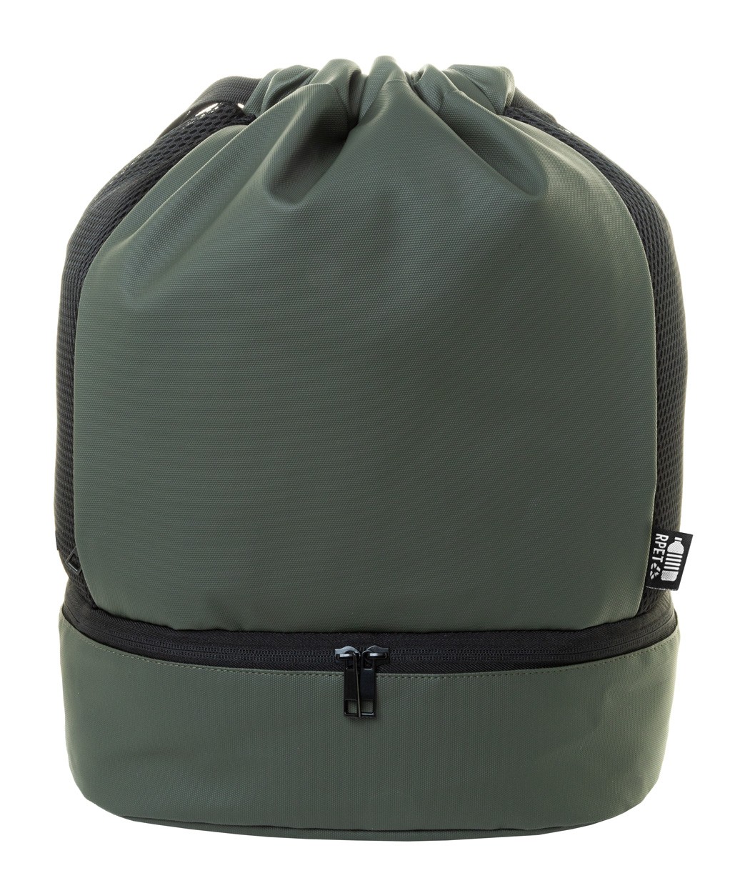 Rucsac premium, RPET, cu șnur, cu compartiment pentru pantofi cu fermoar, incrustații laterale din plasă și bretele largi. Poliester 600D RPET acoperit cu PU cu etichetă RPET distinctă.