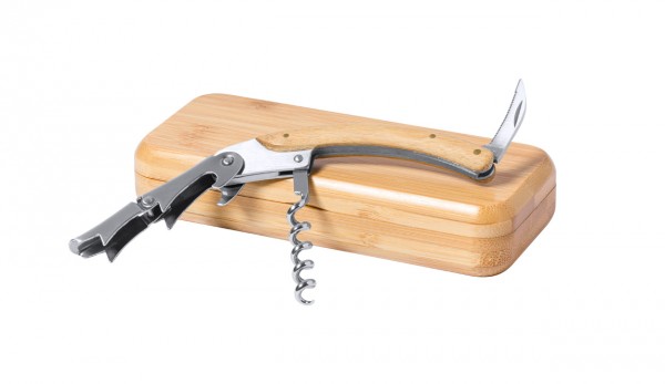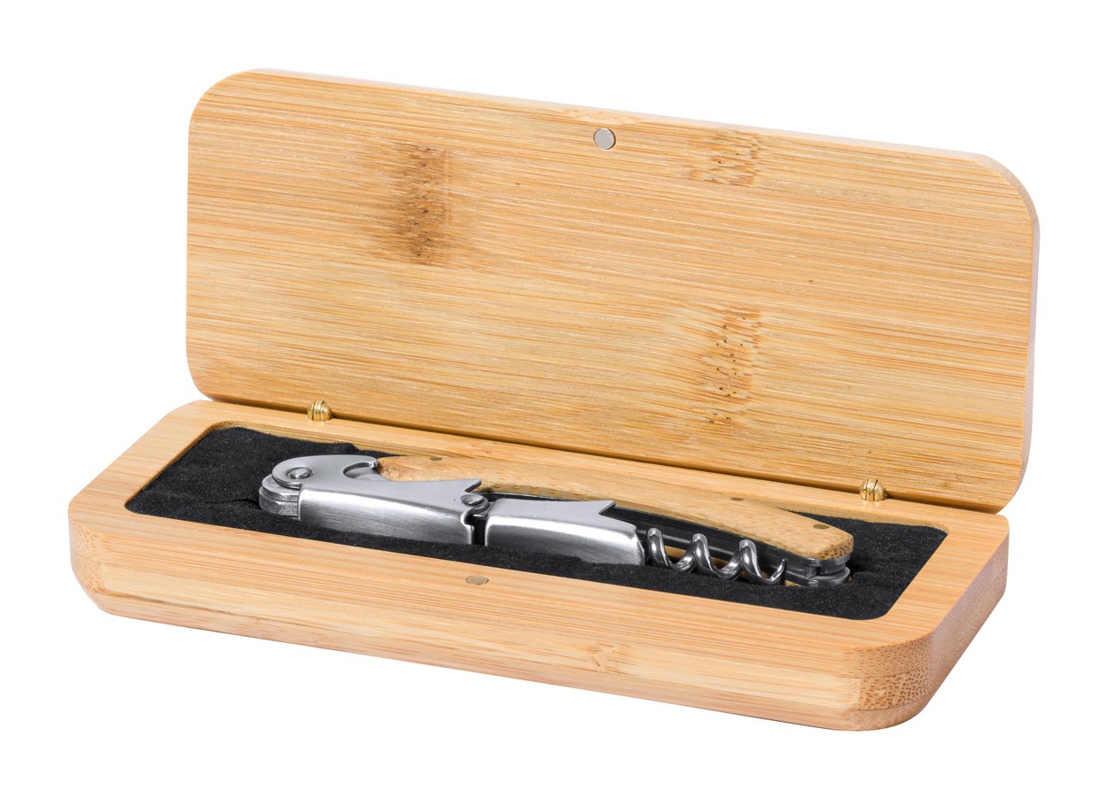 Tirbușon din oțel inoxidabil cu deschizător de sticle și mâner din bambus, in cutie de bambus.