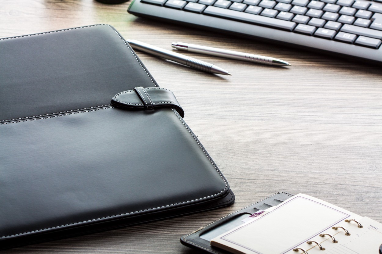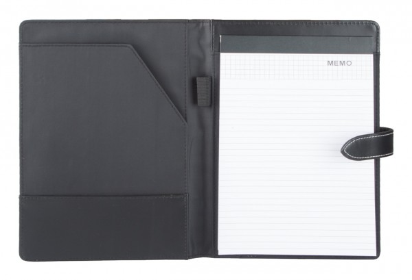 Mapă documente A5 din înlocuitor piele, cu 20 file dictando şi suport pentru pix.