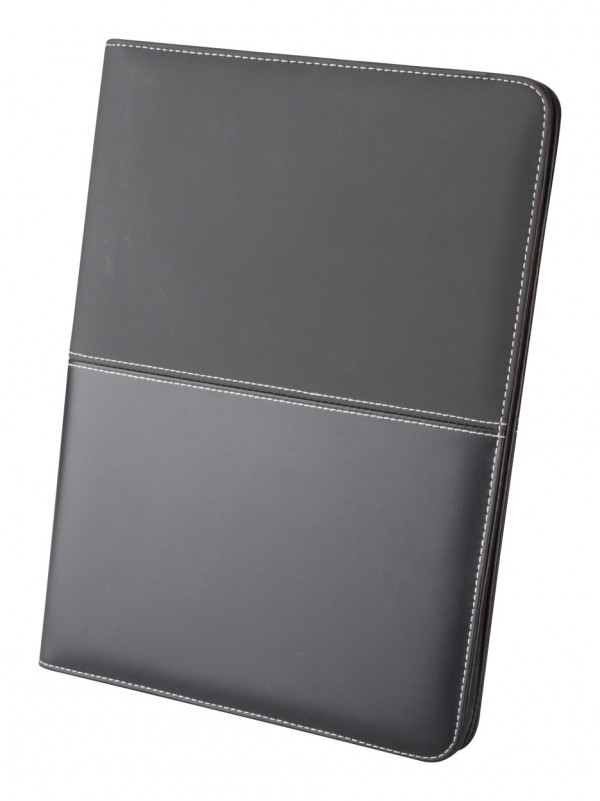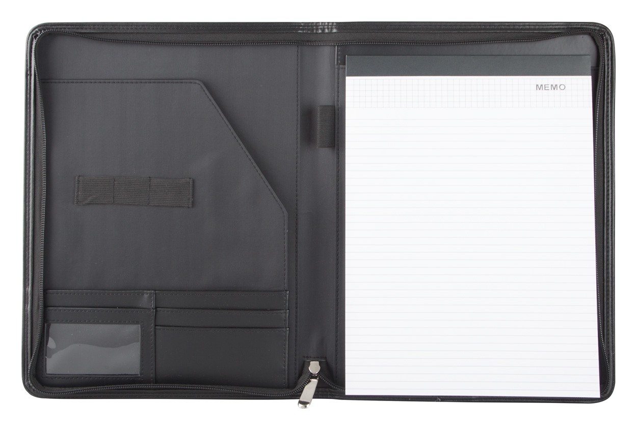 Mapă documente A4 cu fermoar din înlocuitor piele, cu 20 file dictando, suport pentru pix şi suport pentru cărţi de vizită.