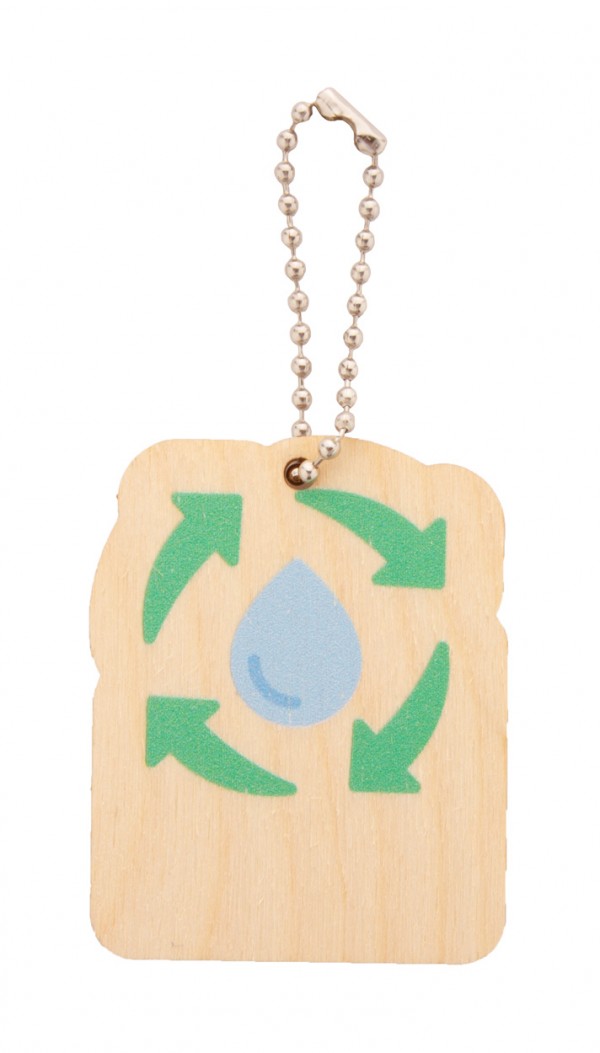 Breloc din placaj de mesteacăn, cu lanț metalic și design tematic pentru protecția mediului.