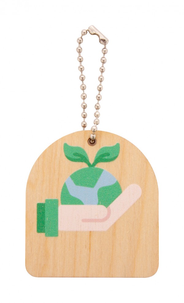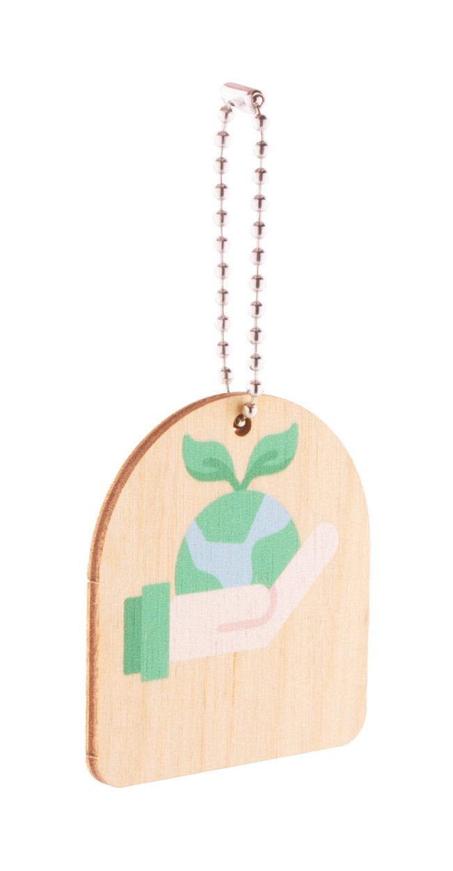 Breloc din placaj de mesteacăn, cu lanț metalic și design tematic pentru protecția mediului.