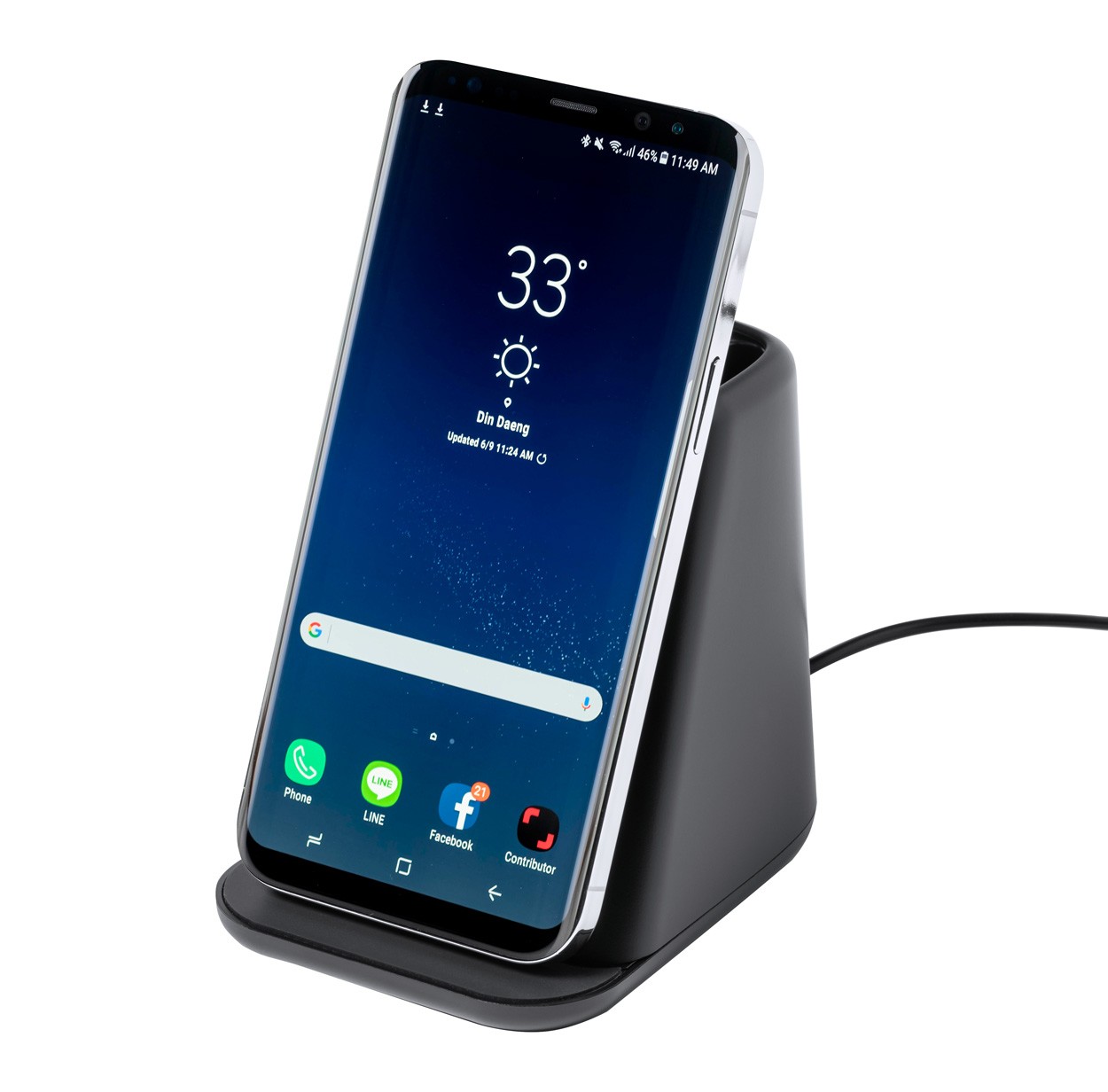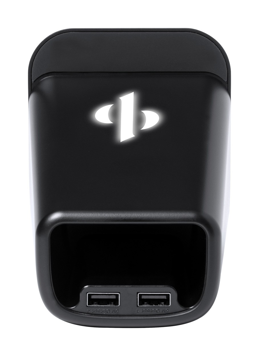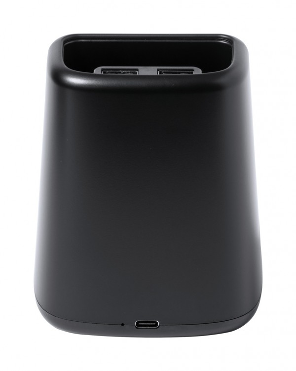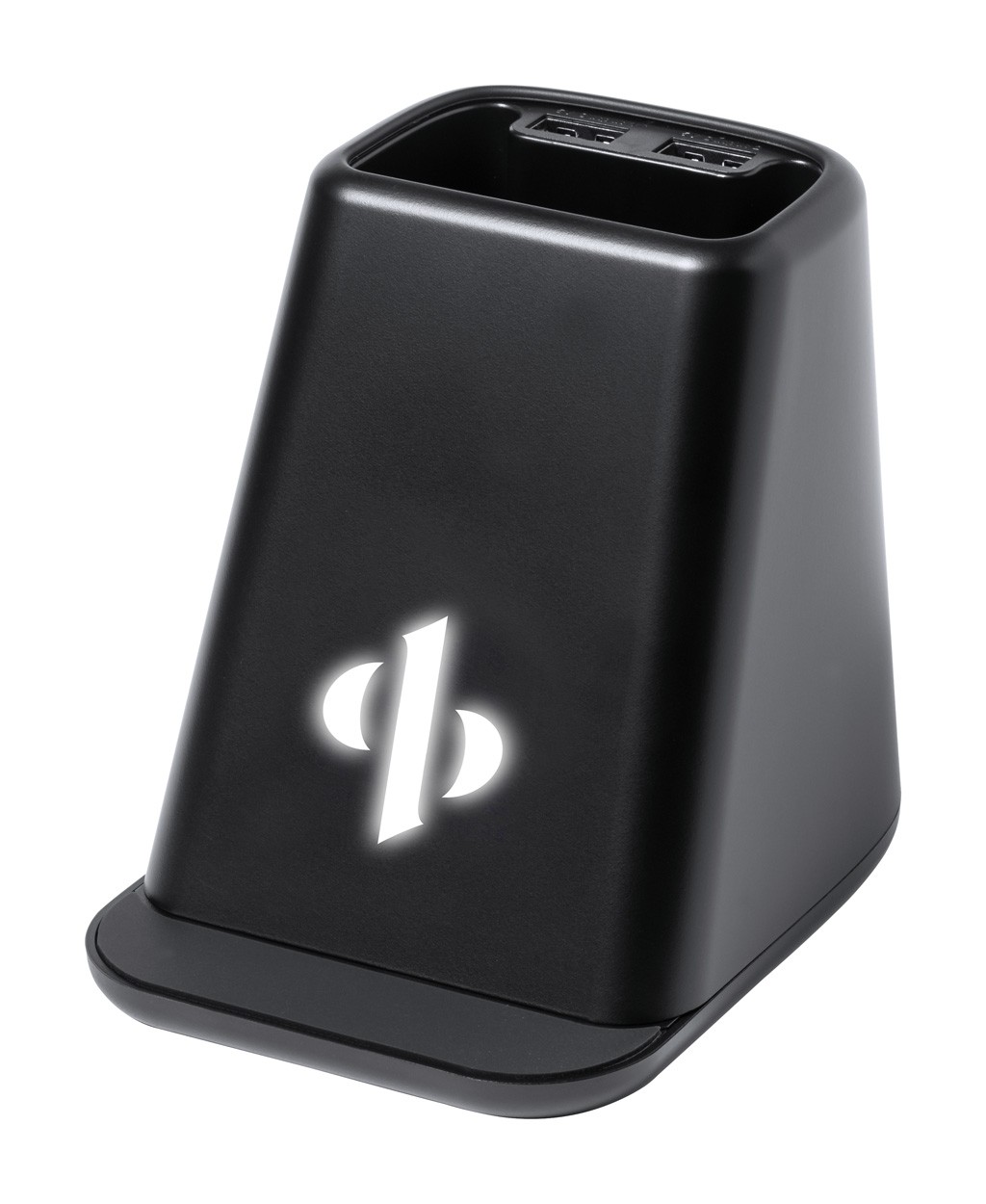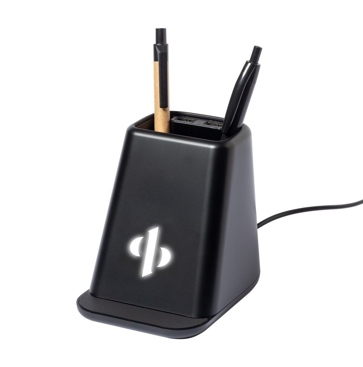 Suport pentru pixuri, multifuncțional, din plastic, cu suport pentru telefon, încărcător wireless încorporat (15W) și lumini LED în interiorul carcasei pentru gravare iluminată. Cu 2 porturi USB pentru încărcător. Inclusiv cablu de încărcare USB.