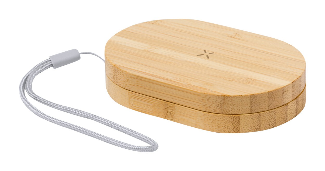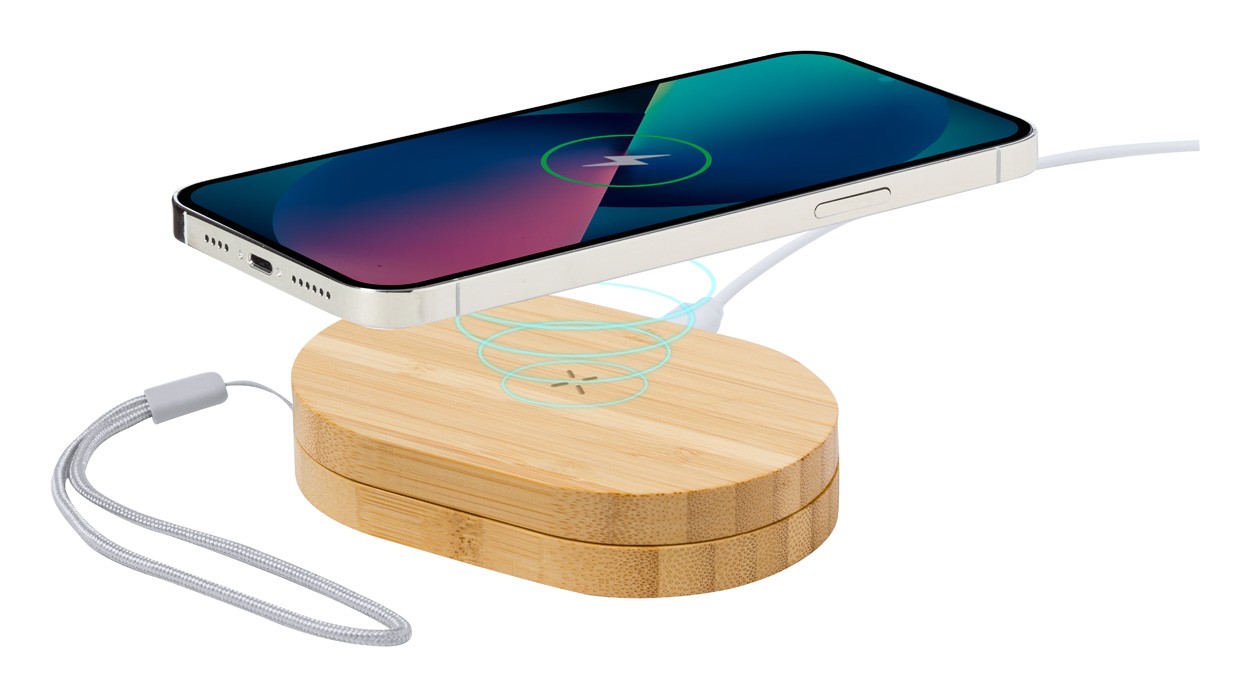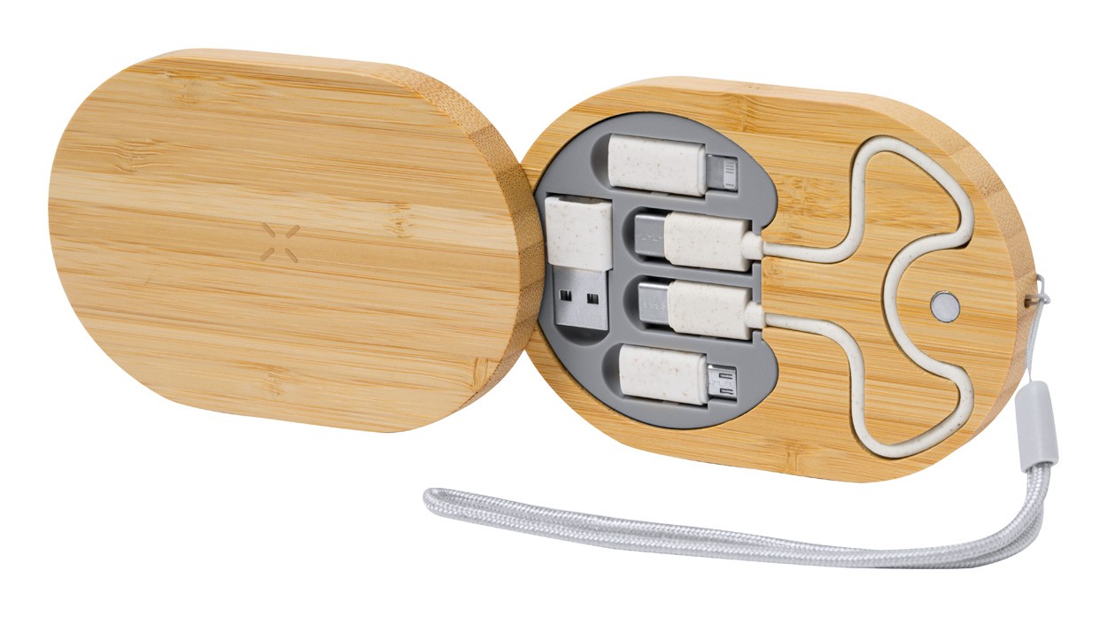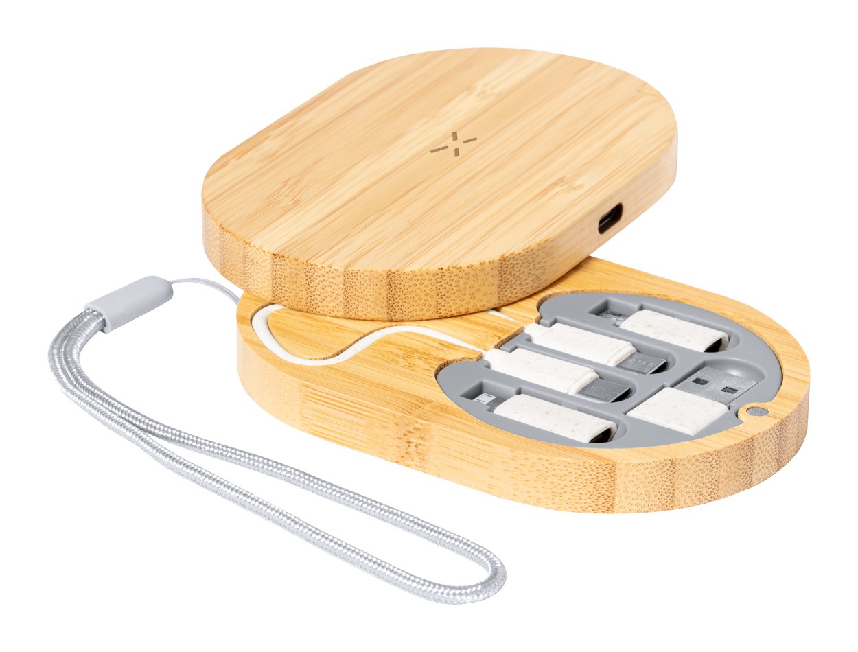 Bamboo USB charger set with wireless fast charger (15W) and USB charger cable with micro USB, USB-C and Lightning connectors. With USB and USB-C inputs.