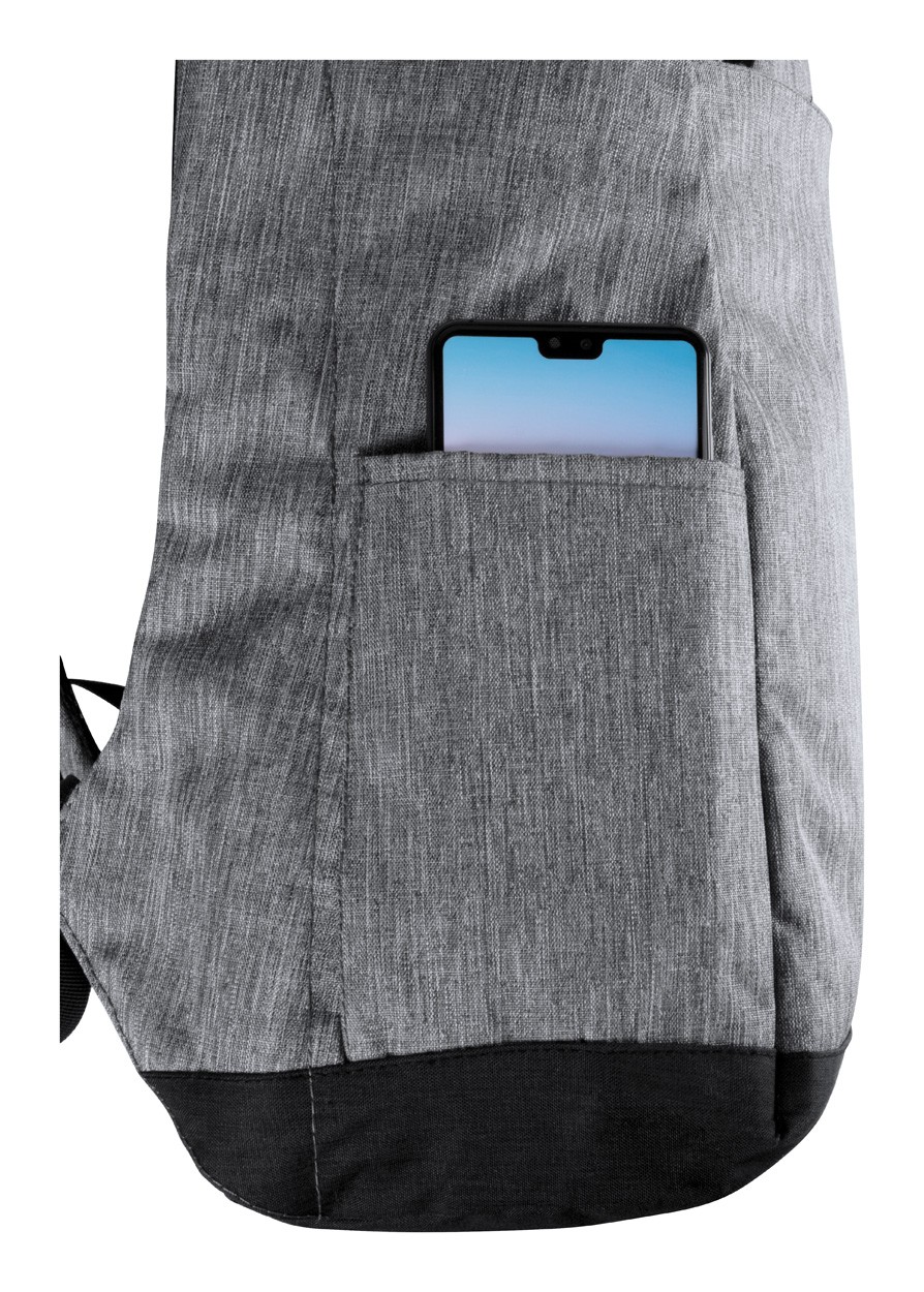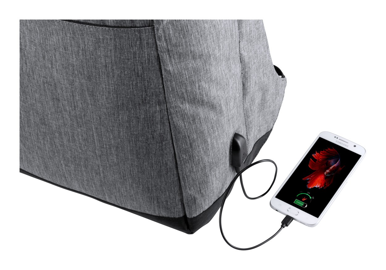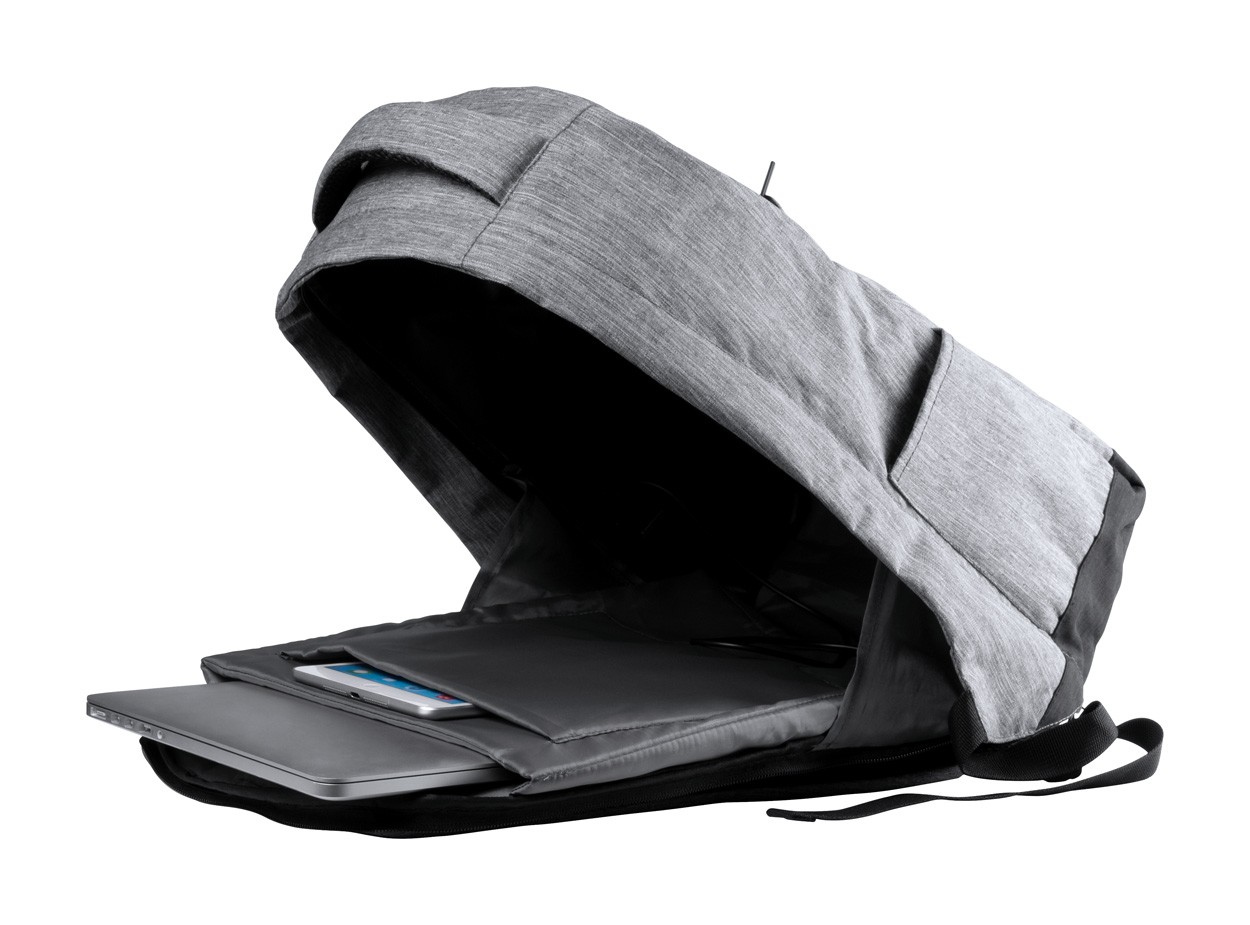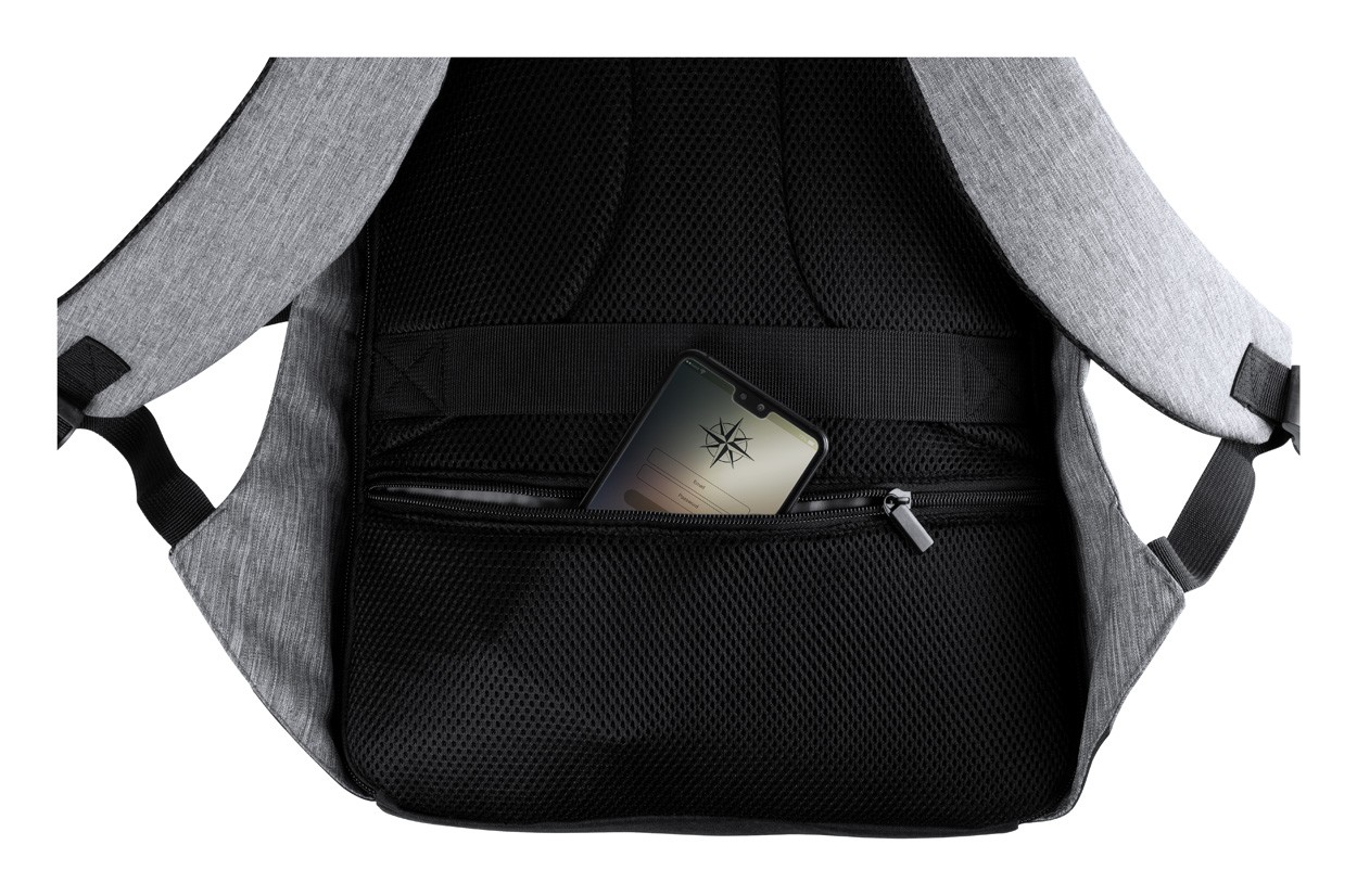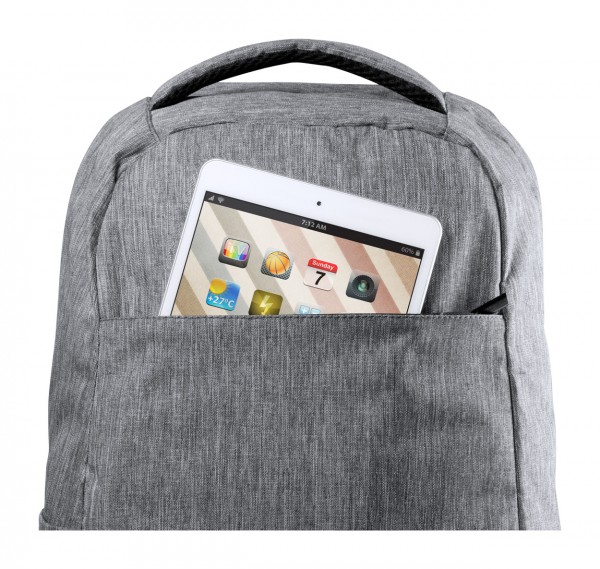 Rucsac antifurt cu mai multe buzunare, compartiment căptușit pentru laptop(15 ") și pentru tabletă (12"), spate și bretele căptușite. Curea pentru cărucior și conexiune USB încorporată pentru power bank. Poliester 300D.