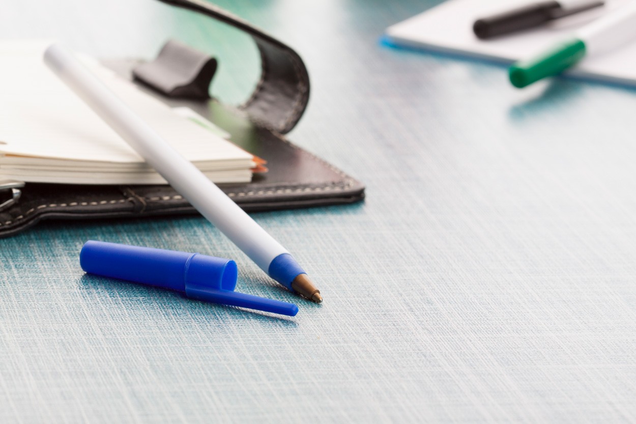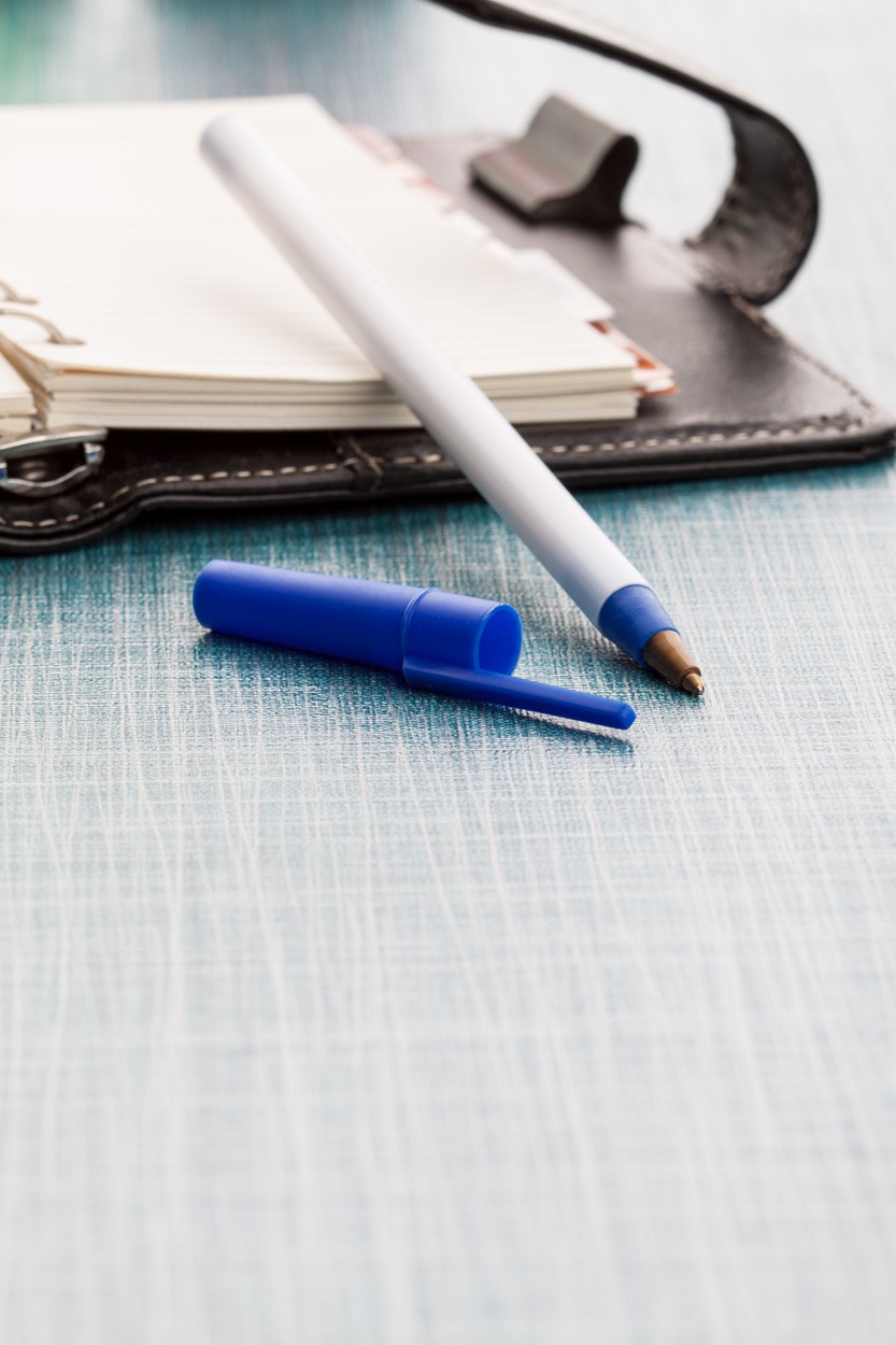 Pix din plastic cu corp alb şi capac colorat. Mină albastră.