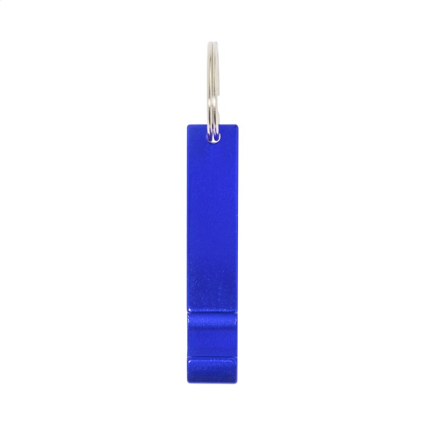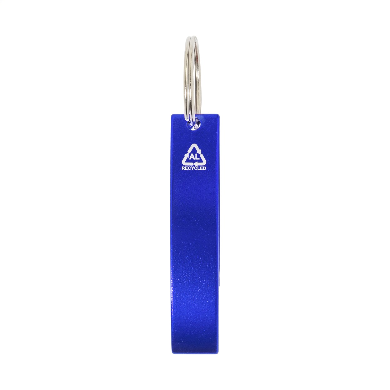 Deschizător de sticle din aluminiu reciclat, cu breloc metalic.