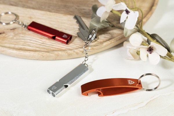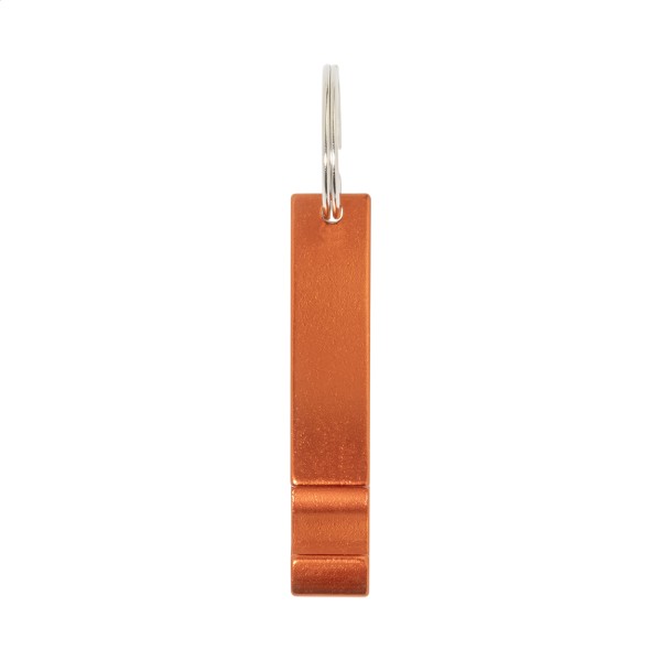 Deschizător de sticle din aluminiu reciclat, cu breloc metalic.