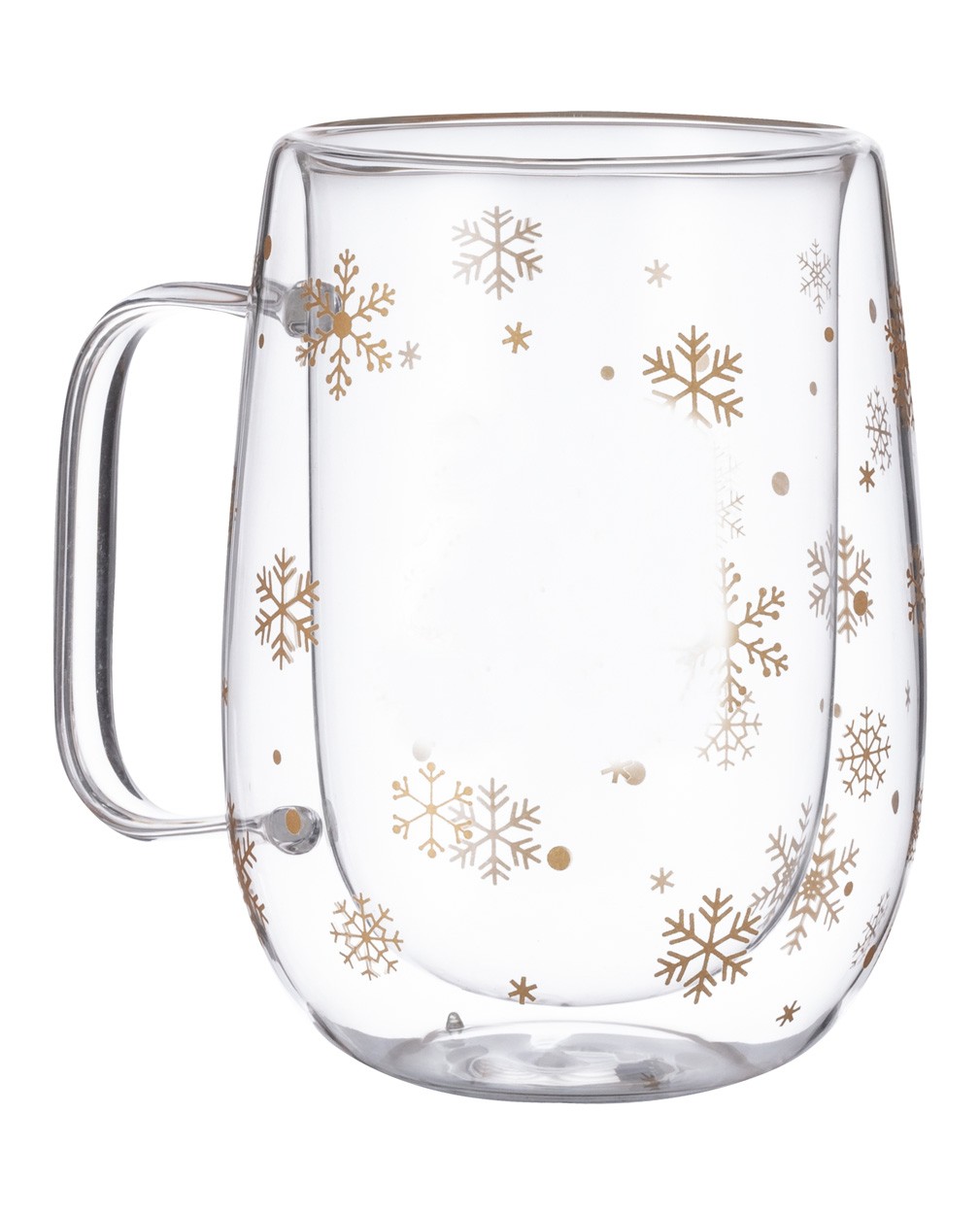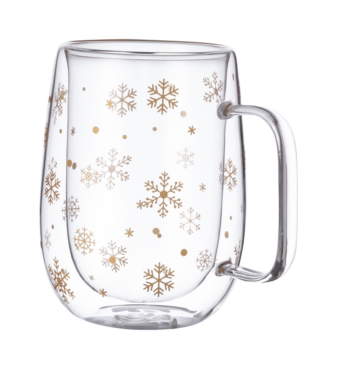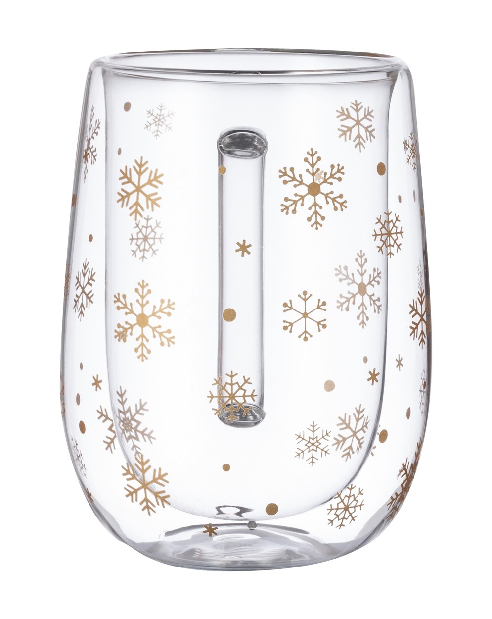 Cană termică din sticlă borosilicată, cu perete dublu, cu model fulgi de zăpadă. 400 ml. În cutie de hârtie neagră.