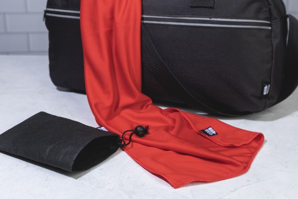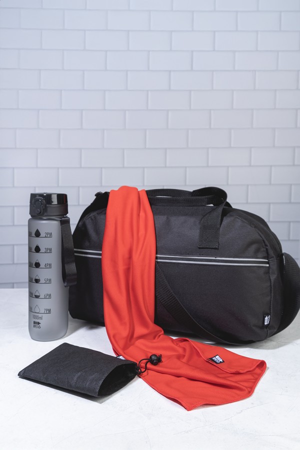 Prosop sport din microfibră, RPET, în husă de transport nețesută RPET cu etichetă RPET distinctivă. Poliester RPET, 140 g/m².