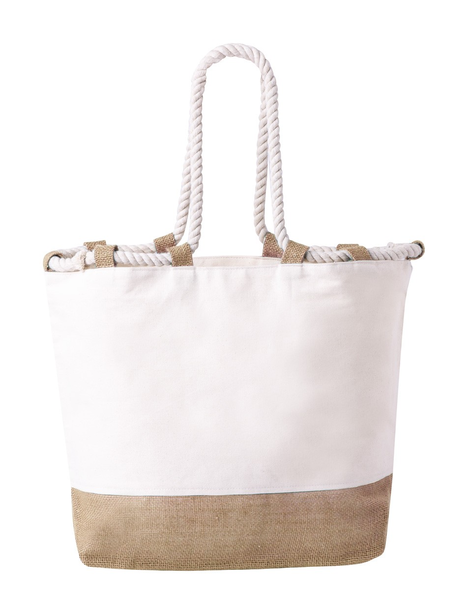 Geantă de plajă bicoloră, din iută și bumbac, cu mânere din șnur împletit, 280 g/m².
