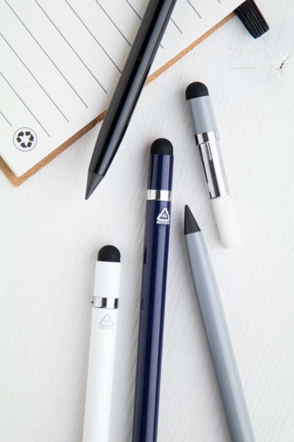 Stilou fără cerneală, de lungă durată, din aluminiu reciclat, cu capăt pentru ecran tactil și vârf din aliaj metalic, care oxidează hârtia. Acest stilou scrie în mod similar cu un creion și este, de asemenea, șters. Inclusiv radieră pe interiorul stiloului tactil.